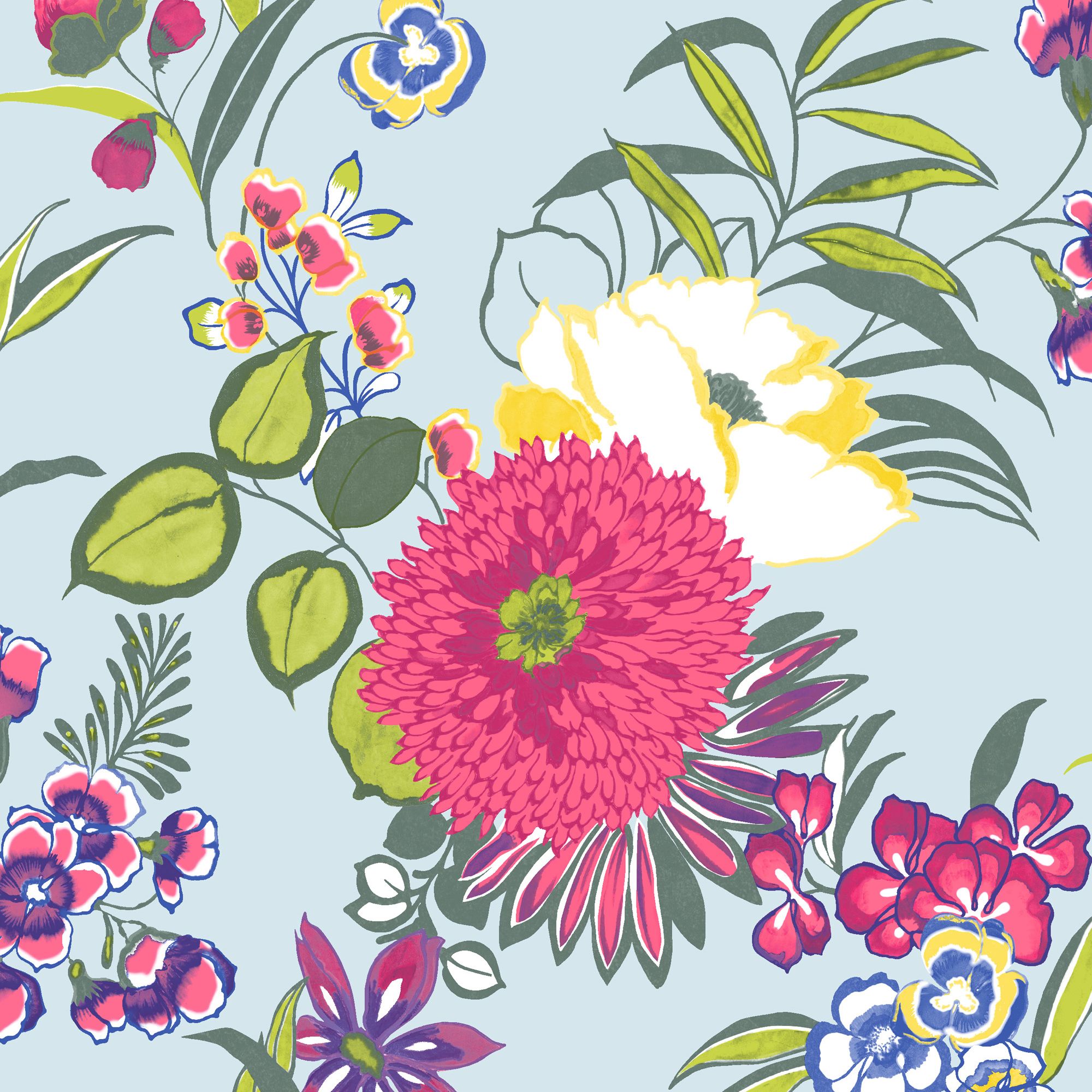Description: A flowery pattern with many different colors and sizes of flowers on a blue background with green leaves and flowers.