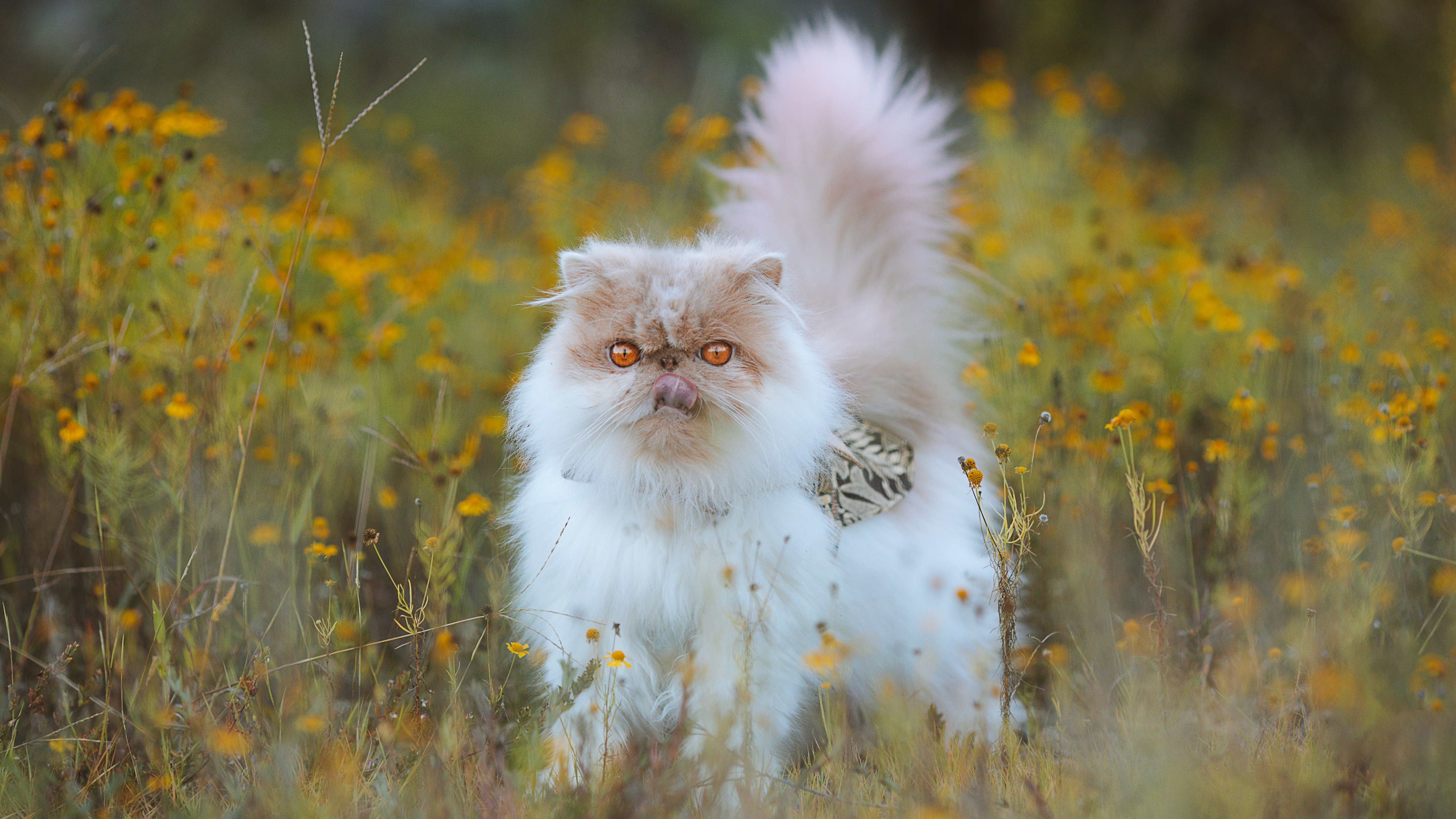 Description: A fluffy cat with a collar and a collared collar standing in a field of flowers and grass with a blurry background.