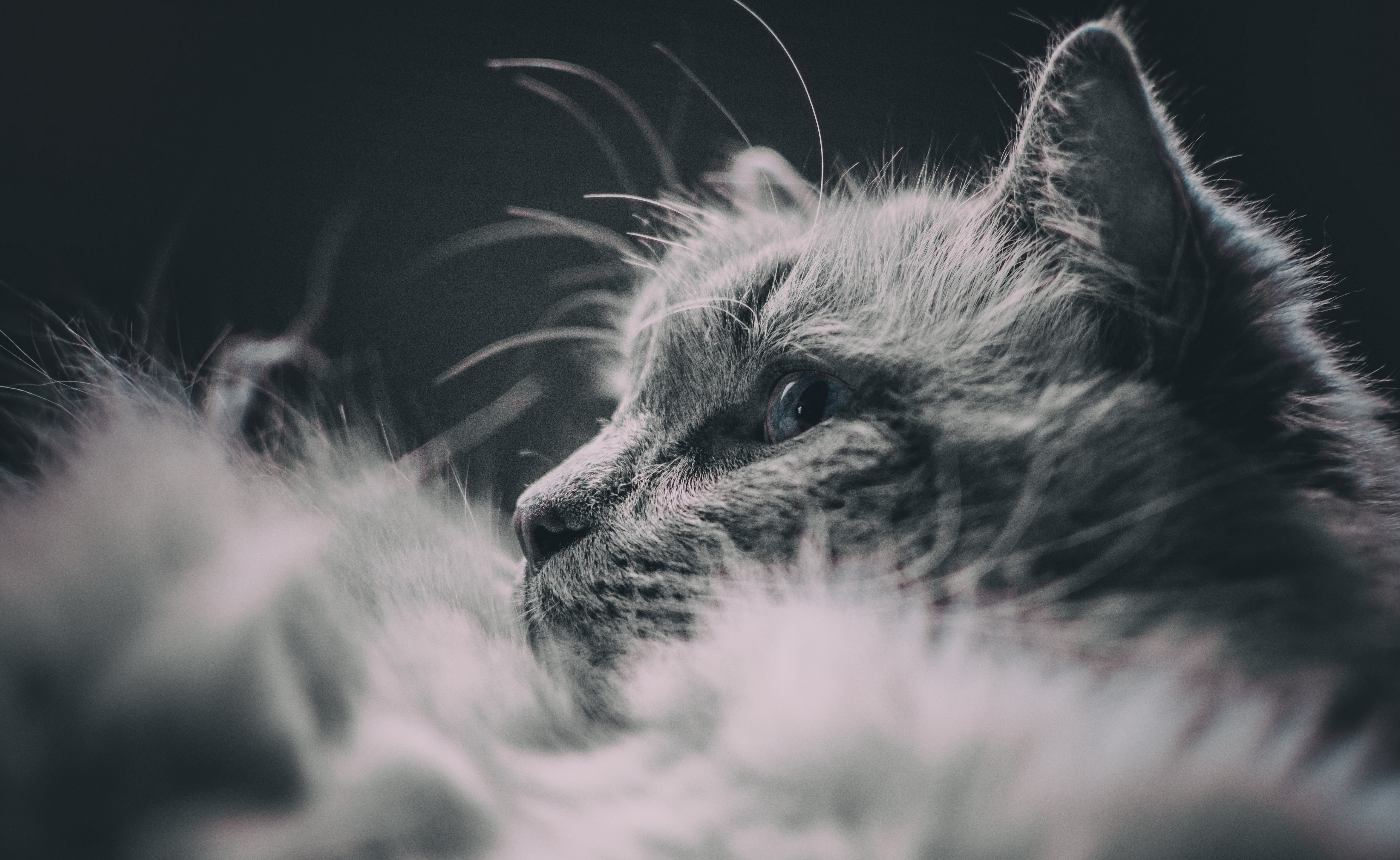 Description: A cat with a fluffy tail laying down on a bed of feathers in a black and white photo with a black background.