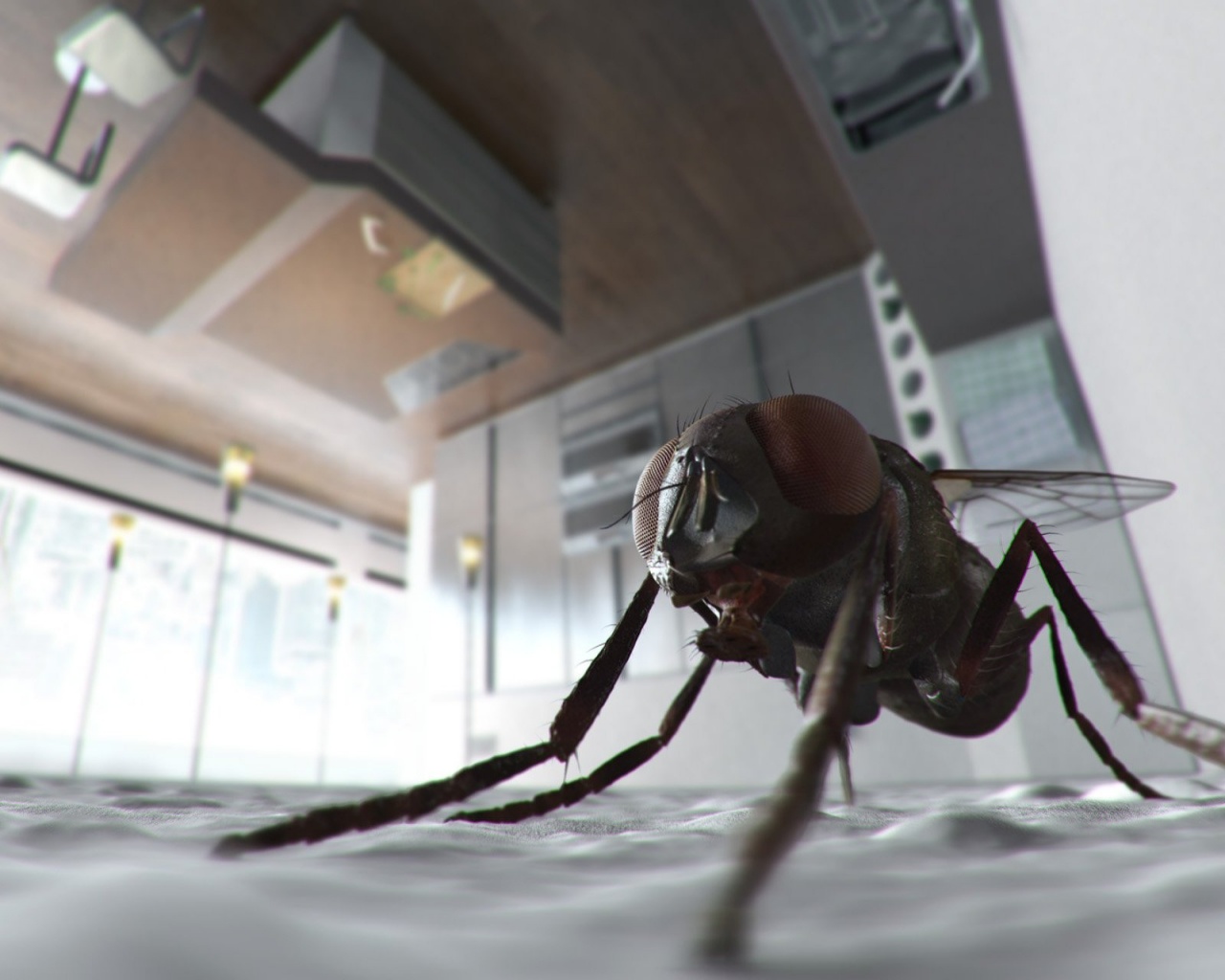 Description: A close up of a fly on a surface in a room with a ceiling light and a wall in the background.