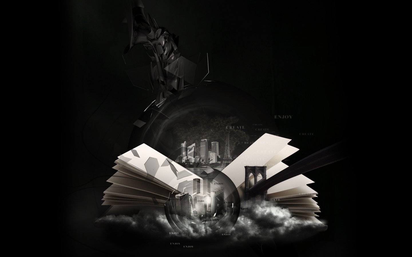 Description: A book is flying through the air with a black background and a black background with a white image of a building.