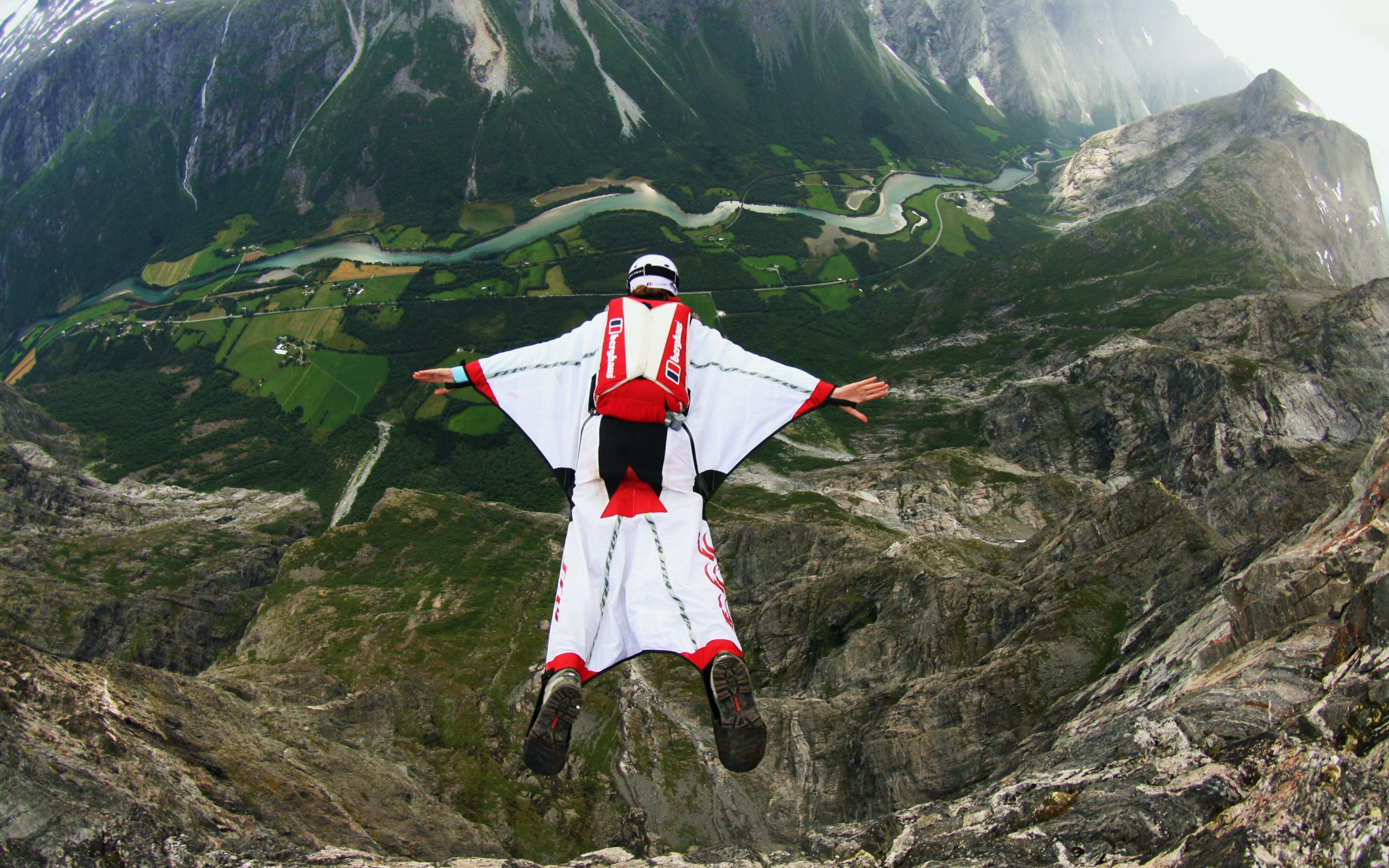 Description: A person in a white and red outfit is flying in the air over a mountain range with a river and a valley.