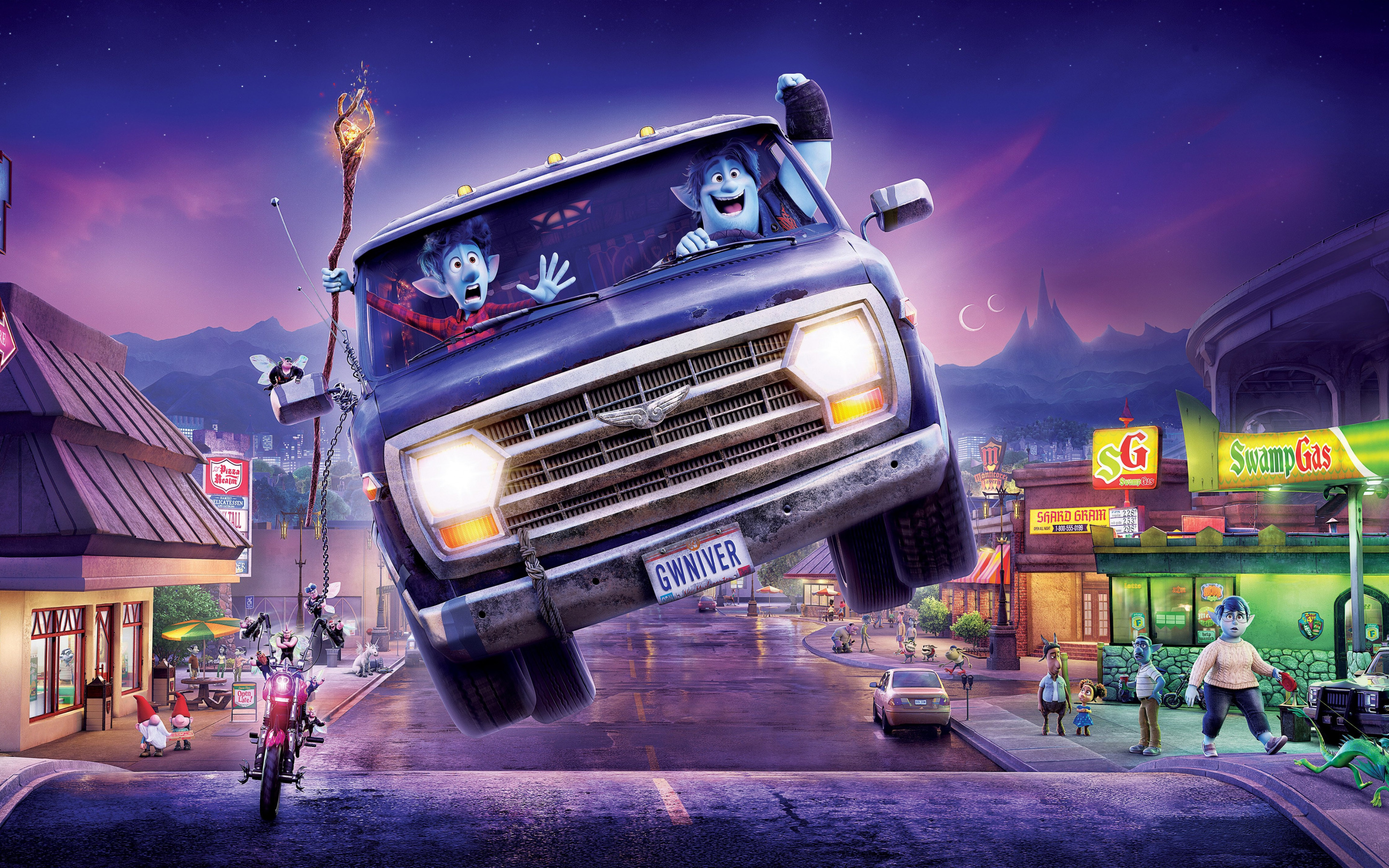 Description: A truck with two clowns on the front of it is flying through the air over a street with a storefront and a person on a motorcycle.