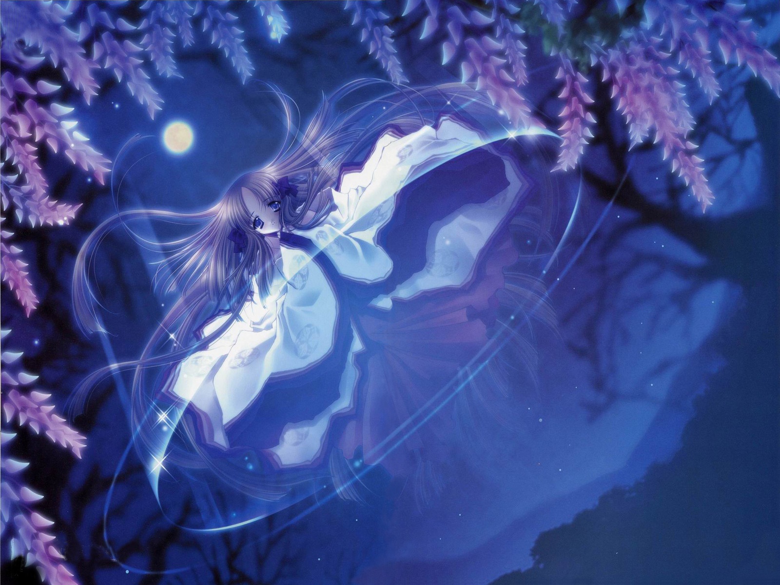 Description: A woman in a white dress is flying through the air with a purple tree in the background and a full moon in the sky.
