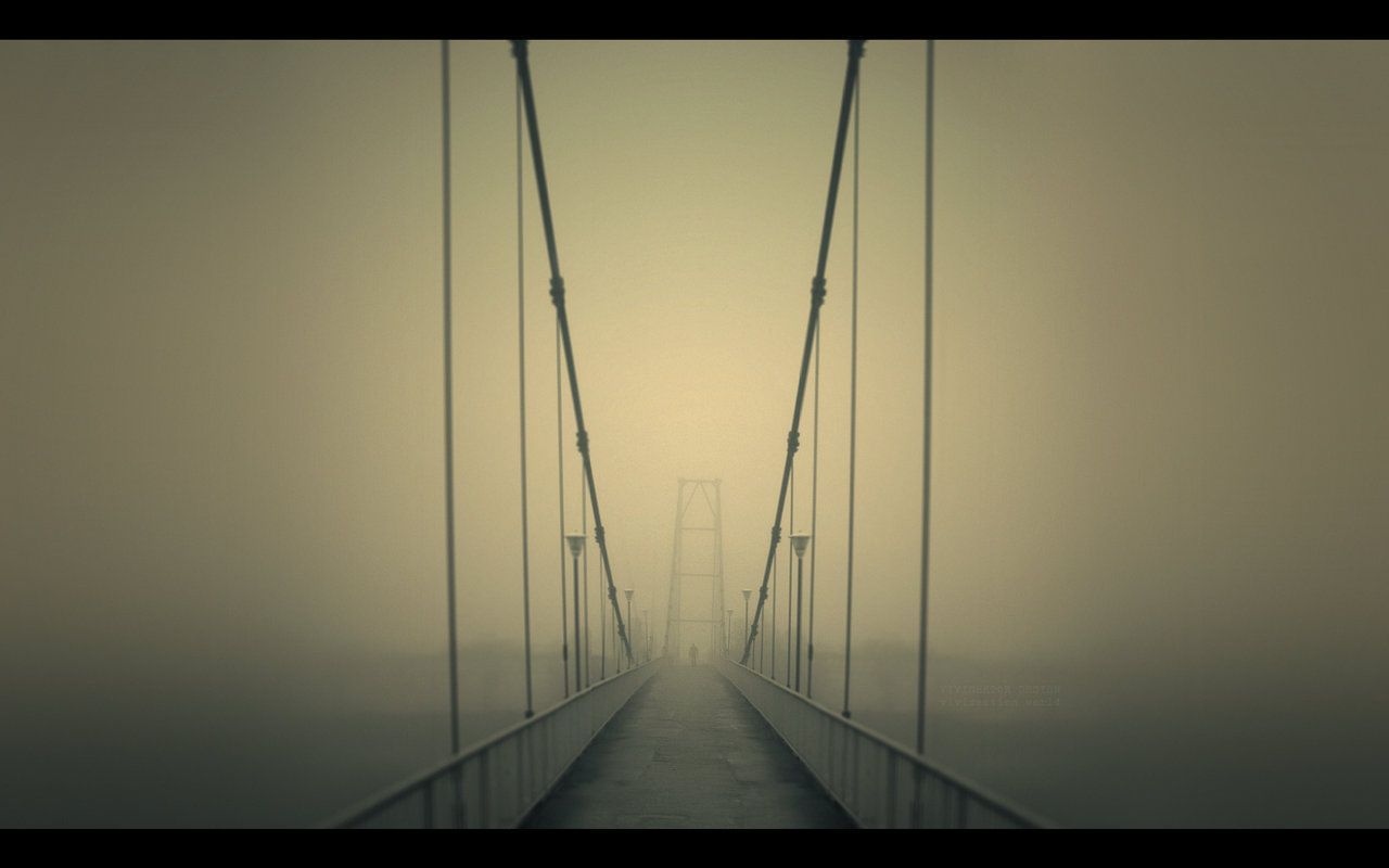 Description: A bridge with a foggy sky and a few lights on it's sides and a few poles on the other side.