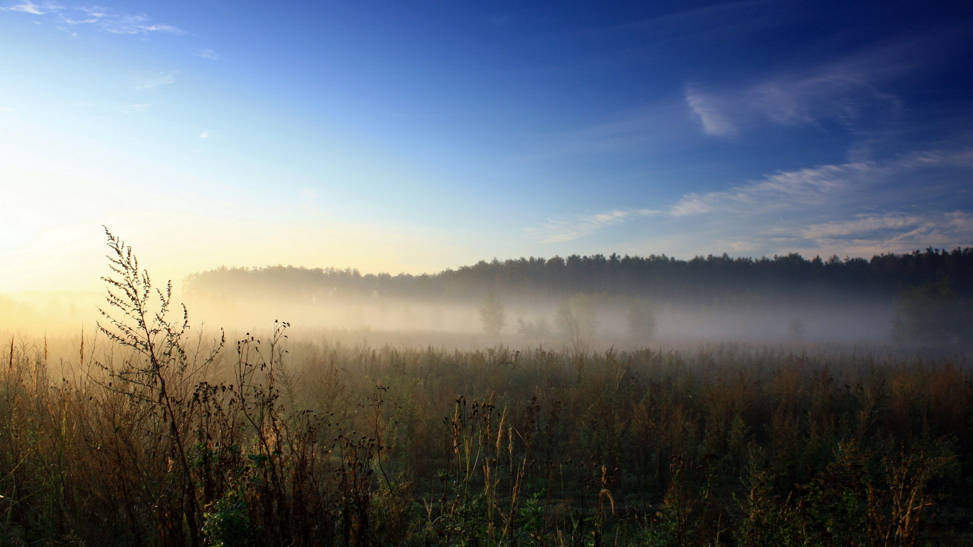 Description: A field with fog and trees in the background at sunrise or dawn with a blue sky and clouds in the foreground.