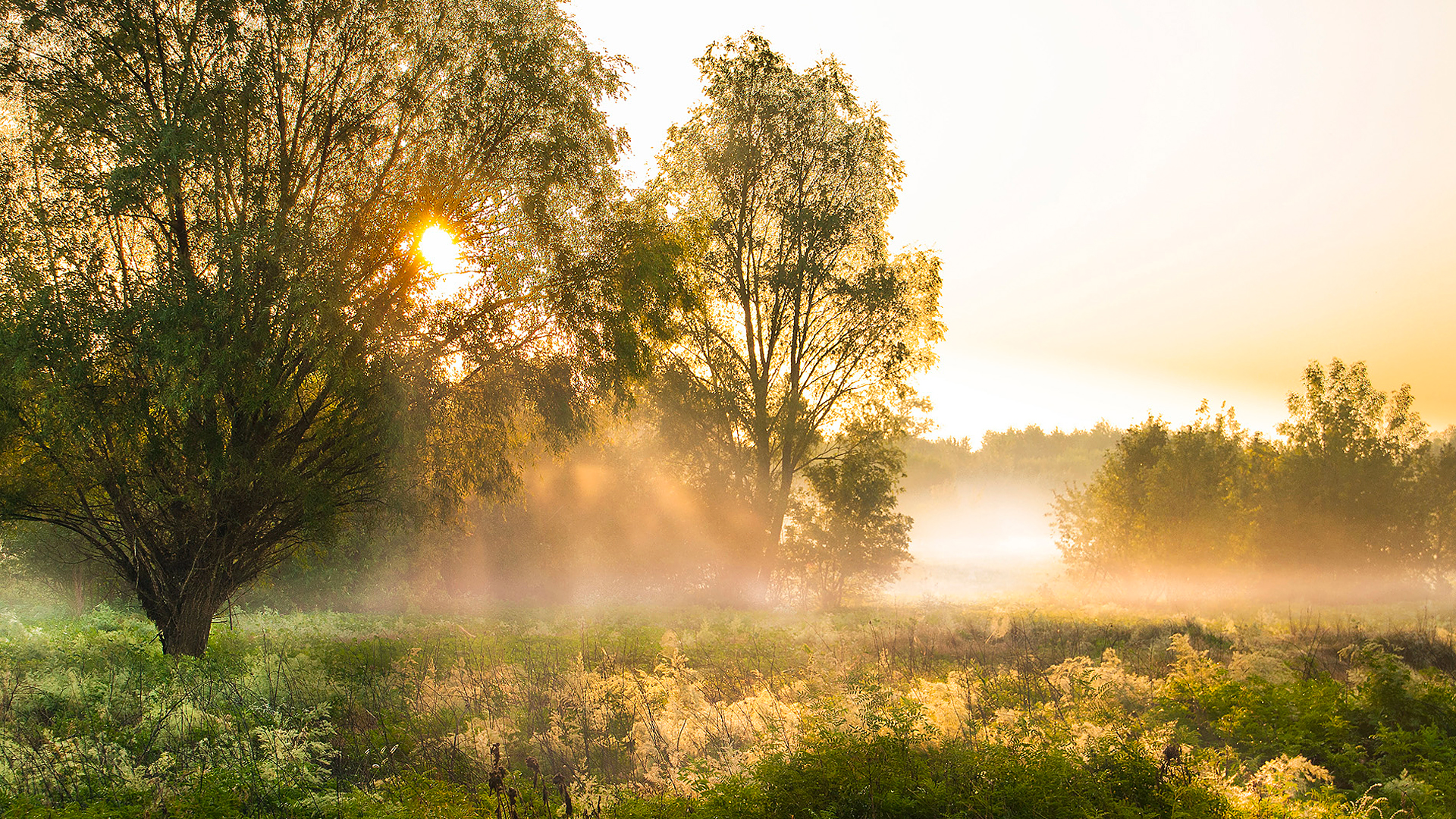 Description: A foggy field with a tree and grass in the foreground and a sunbeam in the background.