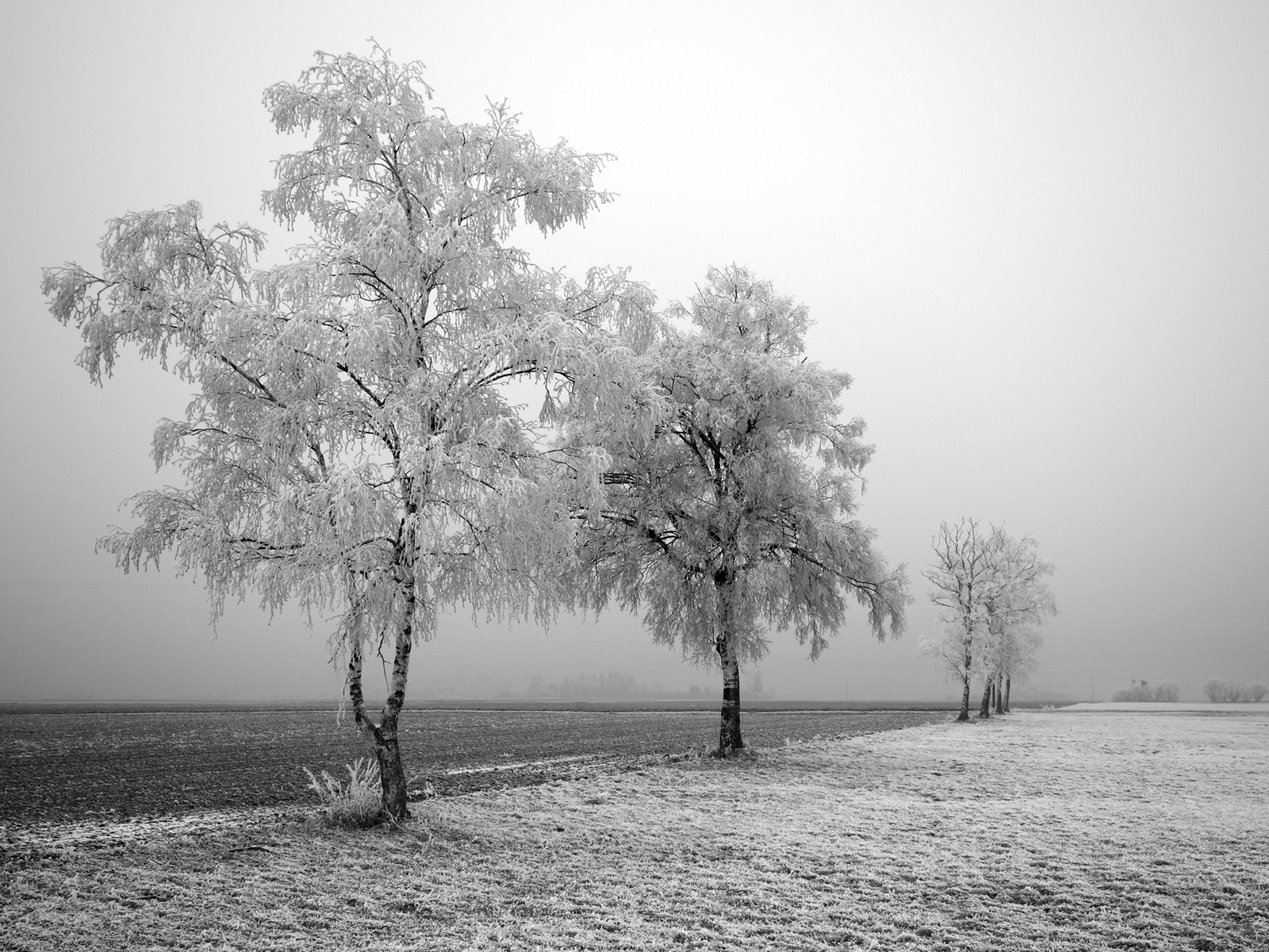 Description: A black and white photo of a field with trees in the fog and a foggy sky in the background.