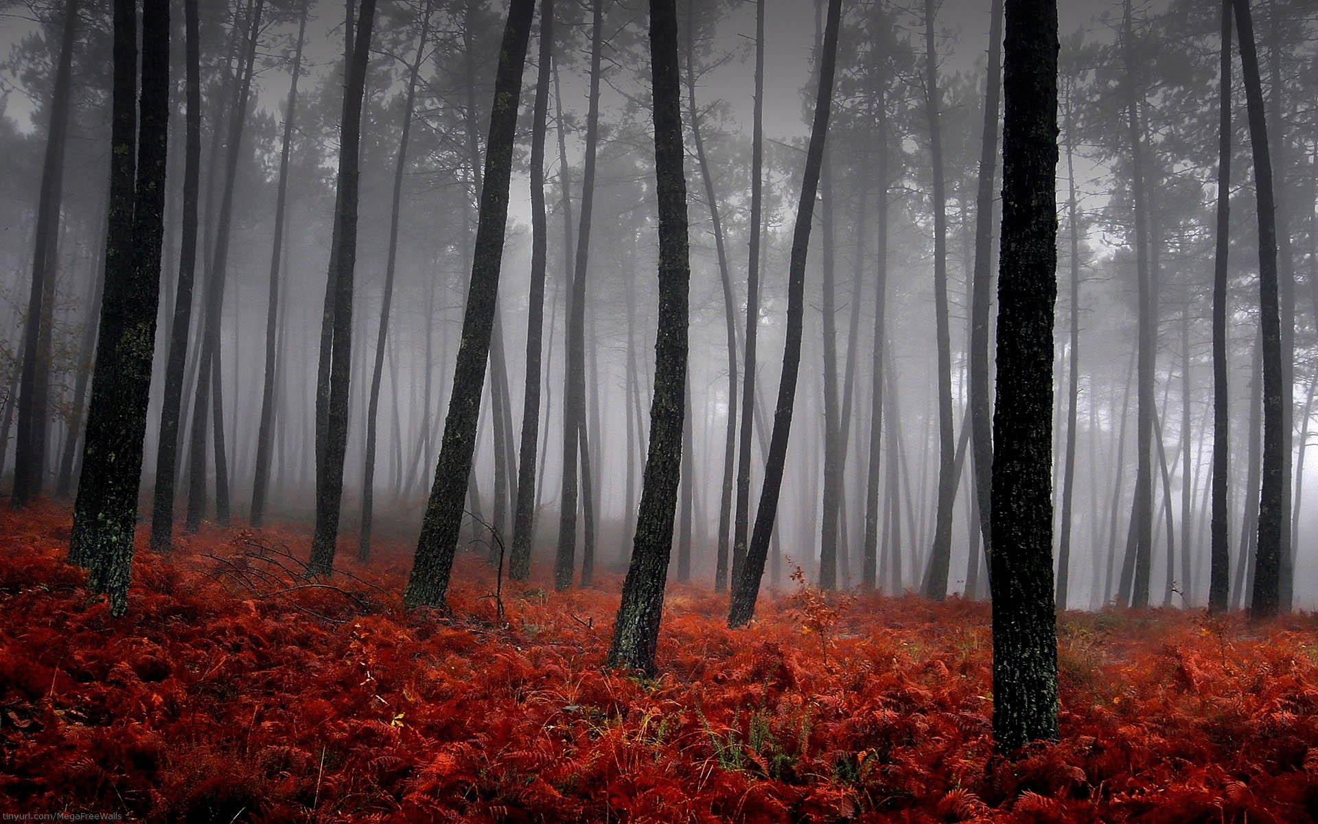 Description: A forest filled with lots of trees and red leaves on the ground in the foggy day with a few trees.