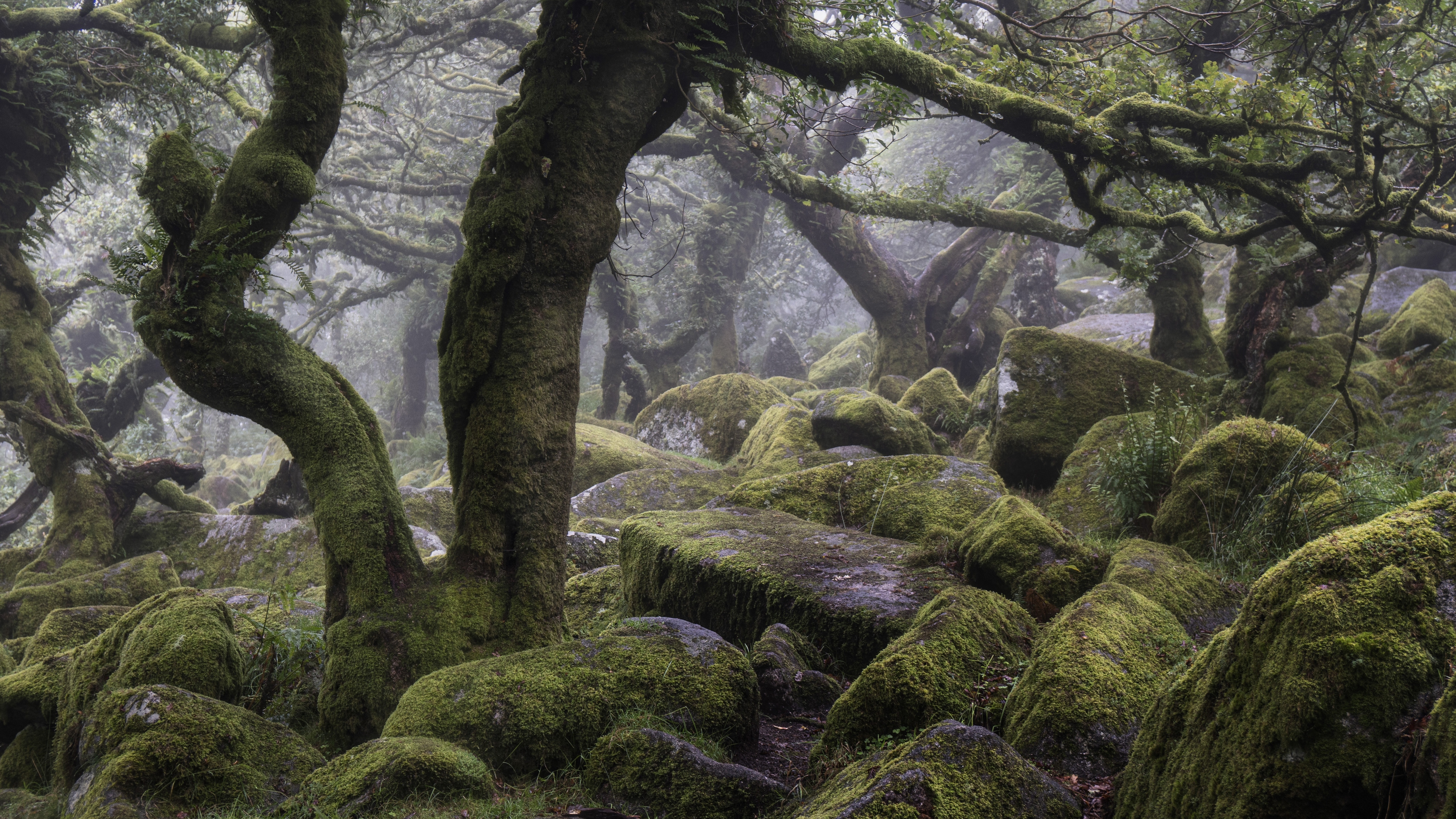 Description: A forest filled with lots of green moss covered rocks and trees in the foggy forest with lots of moss growing on the rocks.