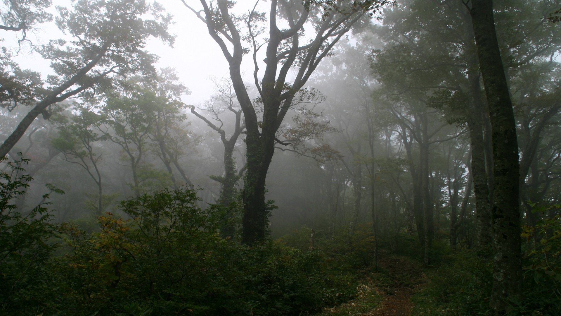 Description: A foggy forest with trees and bushes on a trail in the woods with a bench in the foreground.