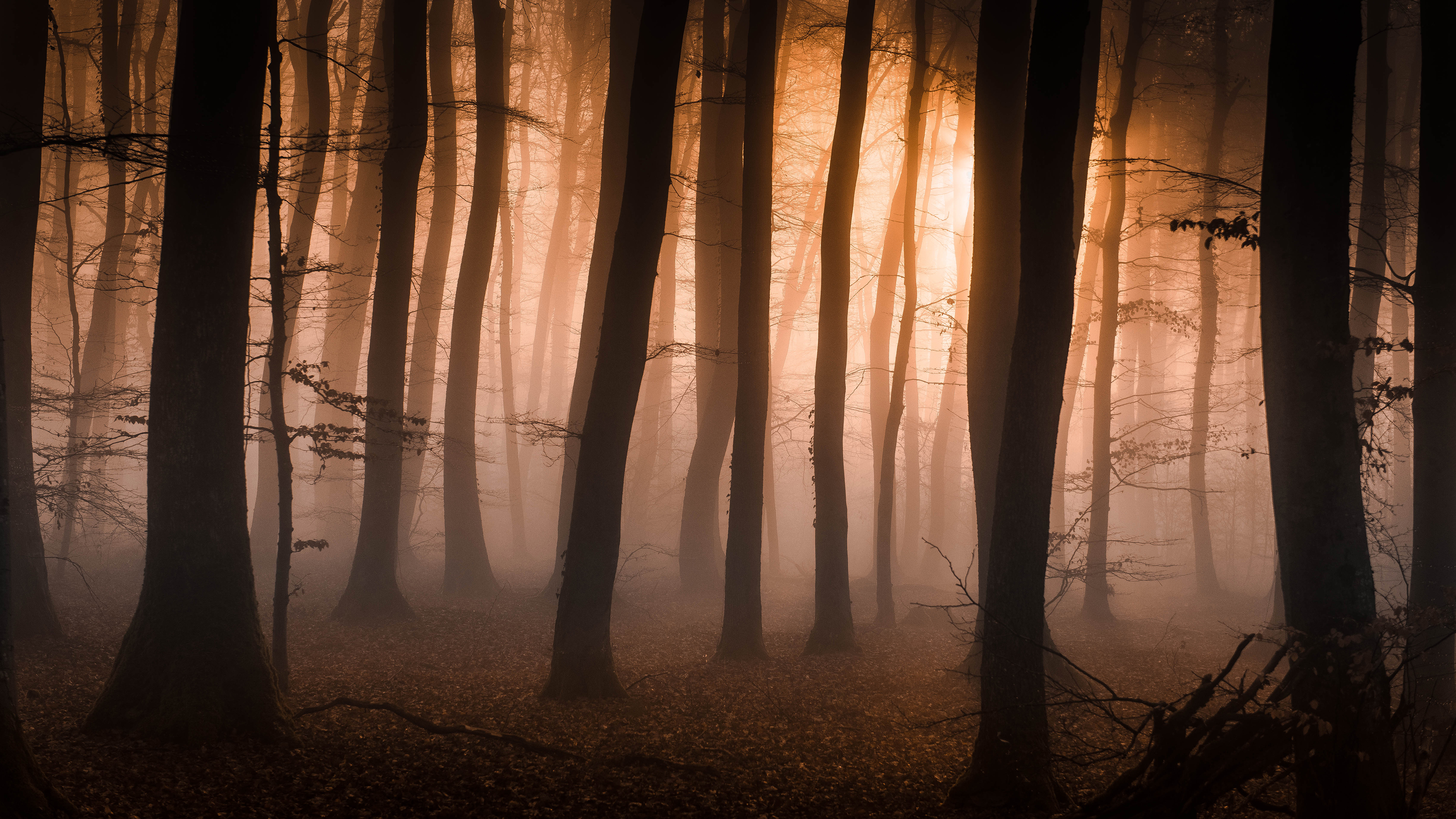 Description: A forest filled with lots of tall trees covered in fog and light at night time with a sun shining through the trees.