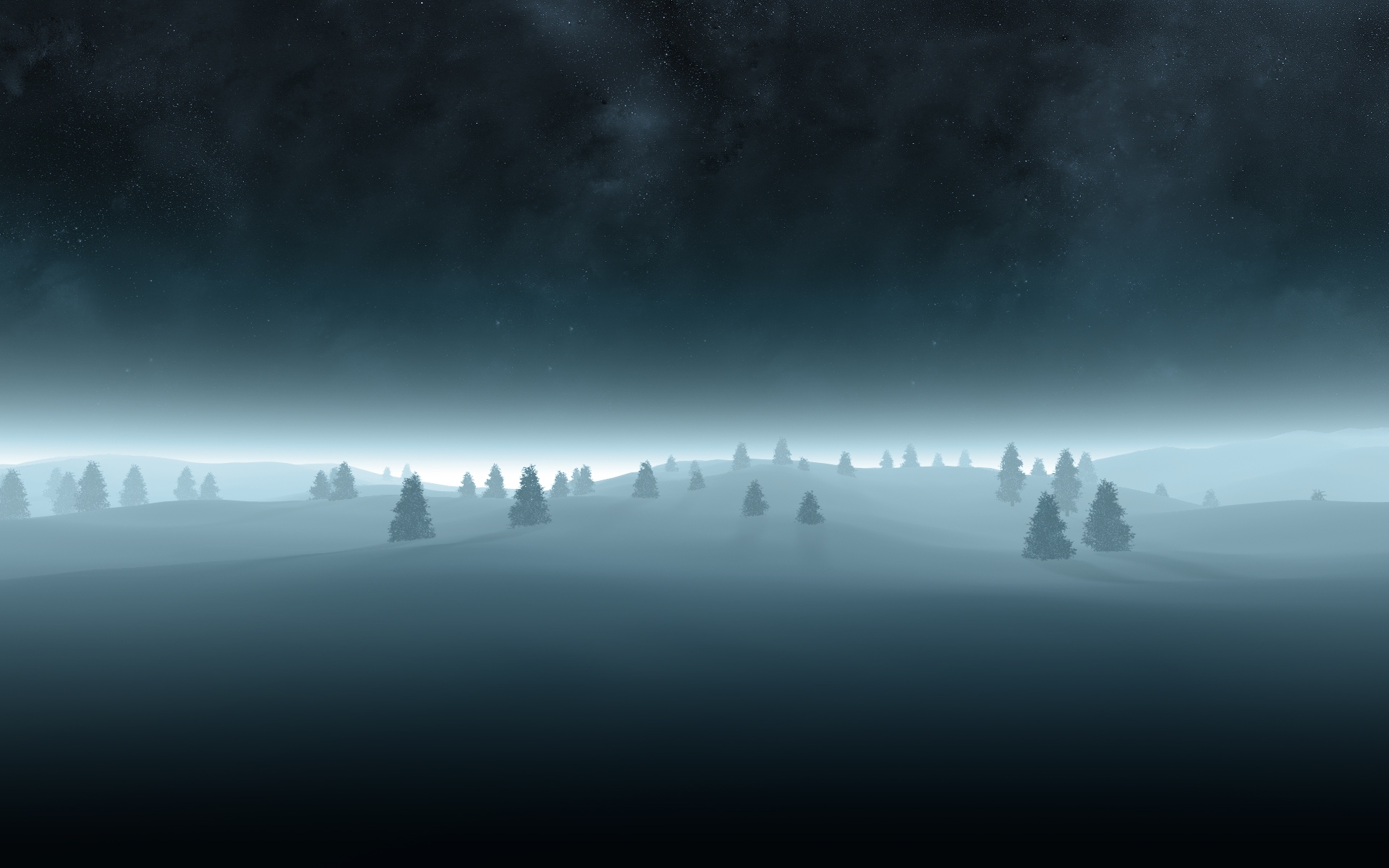 Description: A foggy night with a few trees in the foreground and a distant star in the background.