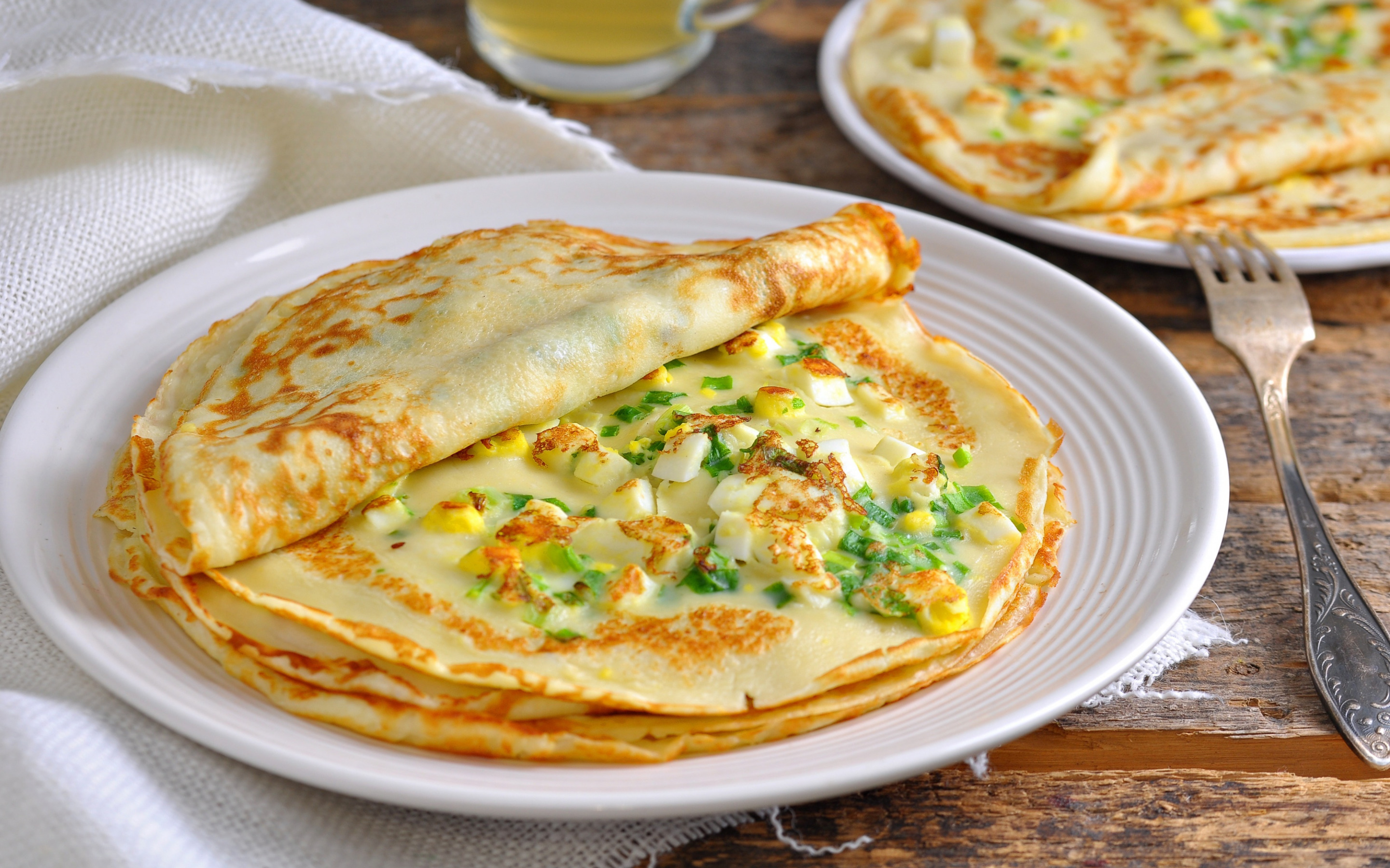 Description: A plate of food with a fork and a glass of juice on the side of the plate and another plate with a fork and a plate of food on the side.