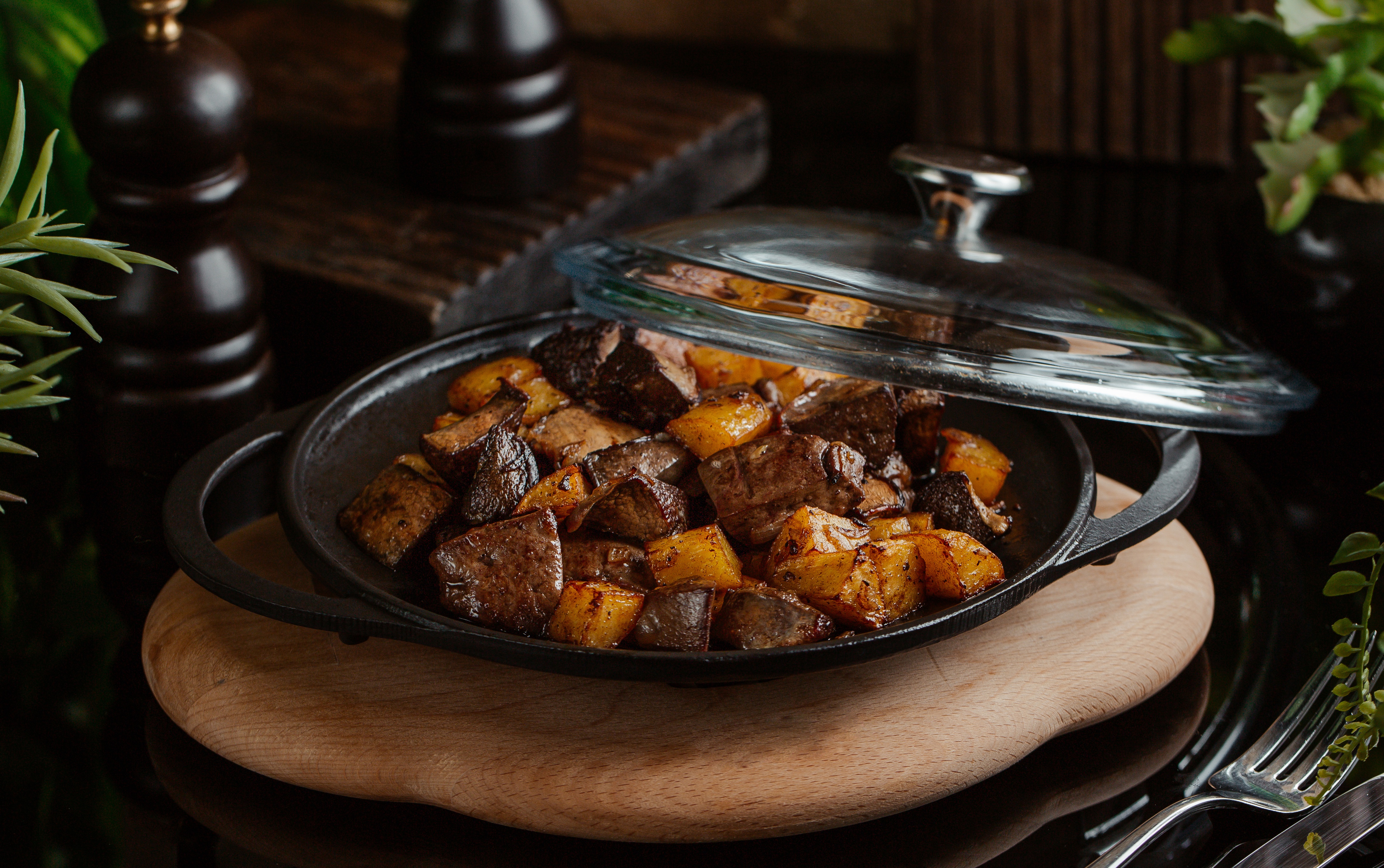 Description: A plate of food on a table with a glass lid on it and a wooden board with a knife and fork.
