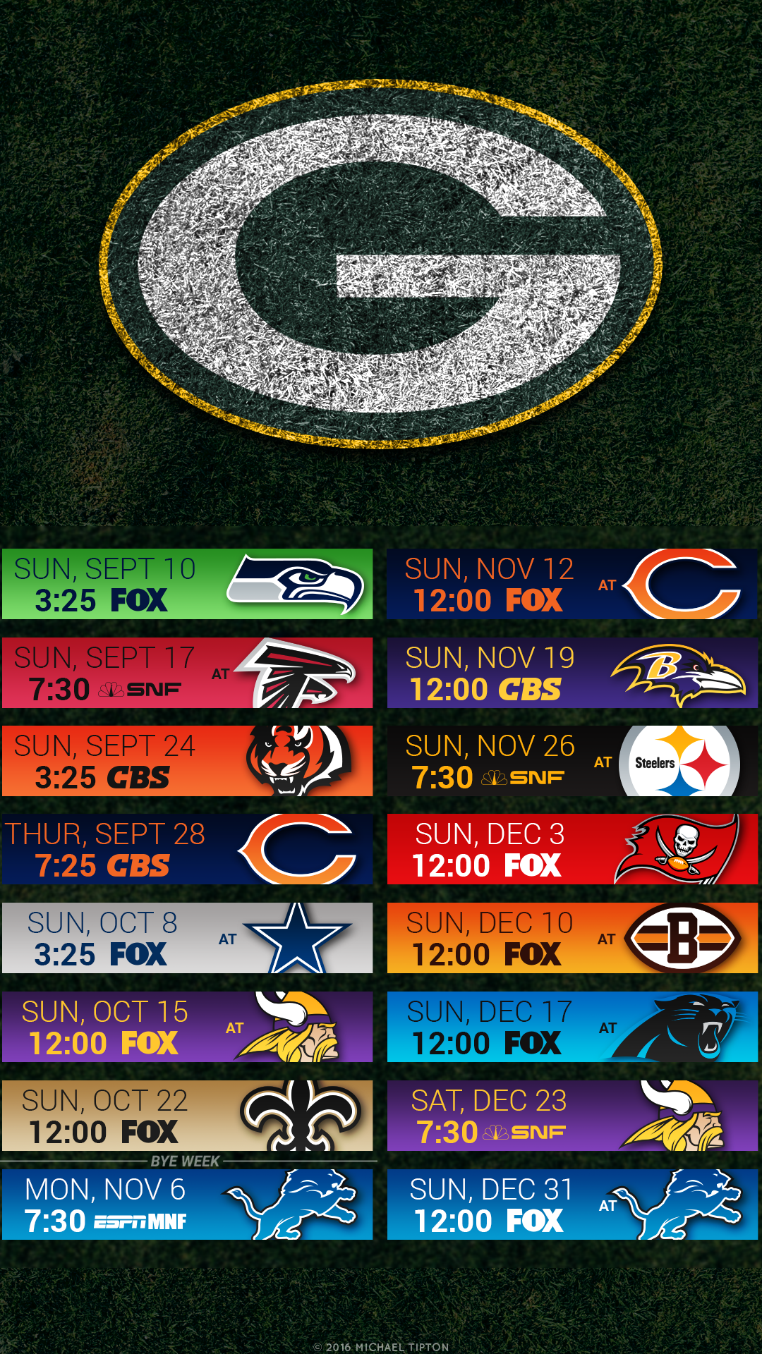 Description: A football field with a green bay logo on it and a line of footballs on it with the name of each team.