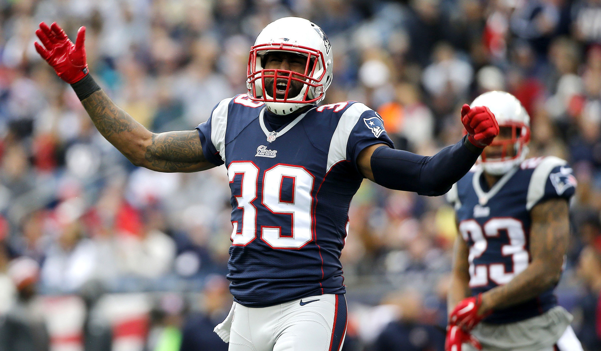 Description: A football player is celebrating a play during a game with a crowd in the background and a man in a helmet is holding his arms up.