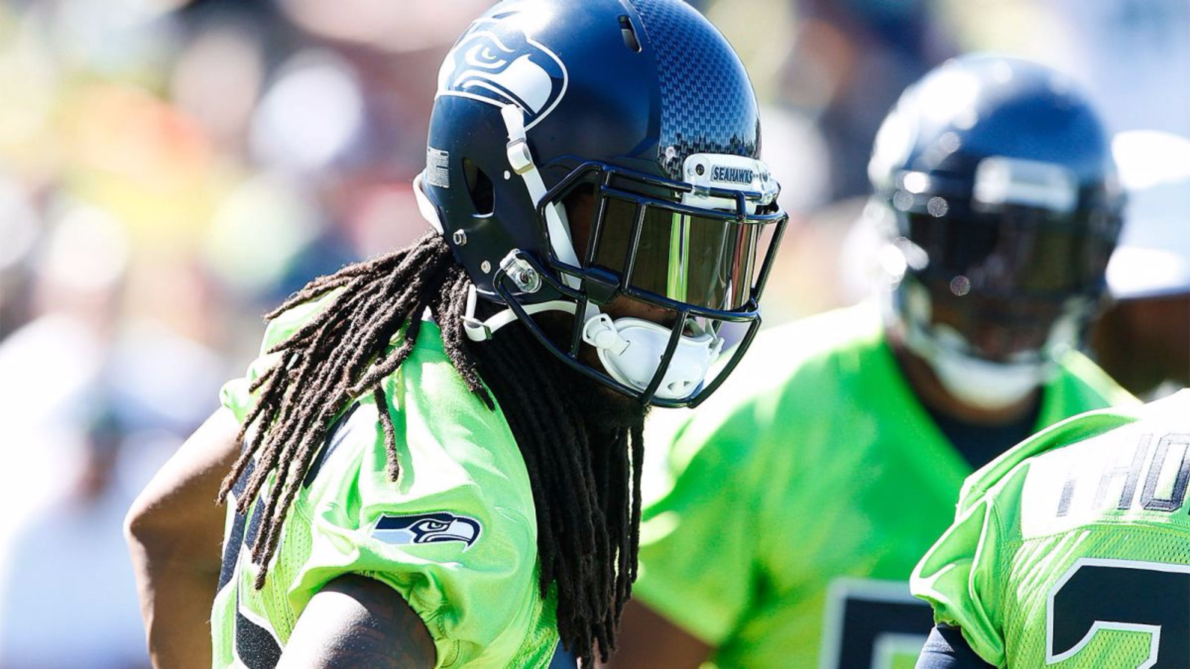 Description: A close up of a football player wearing a helmet and dreadlocks on his head and a football player in the background.