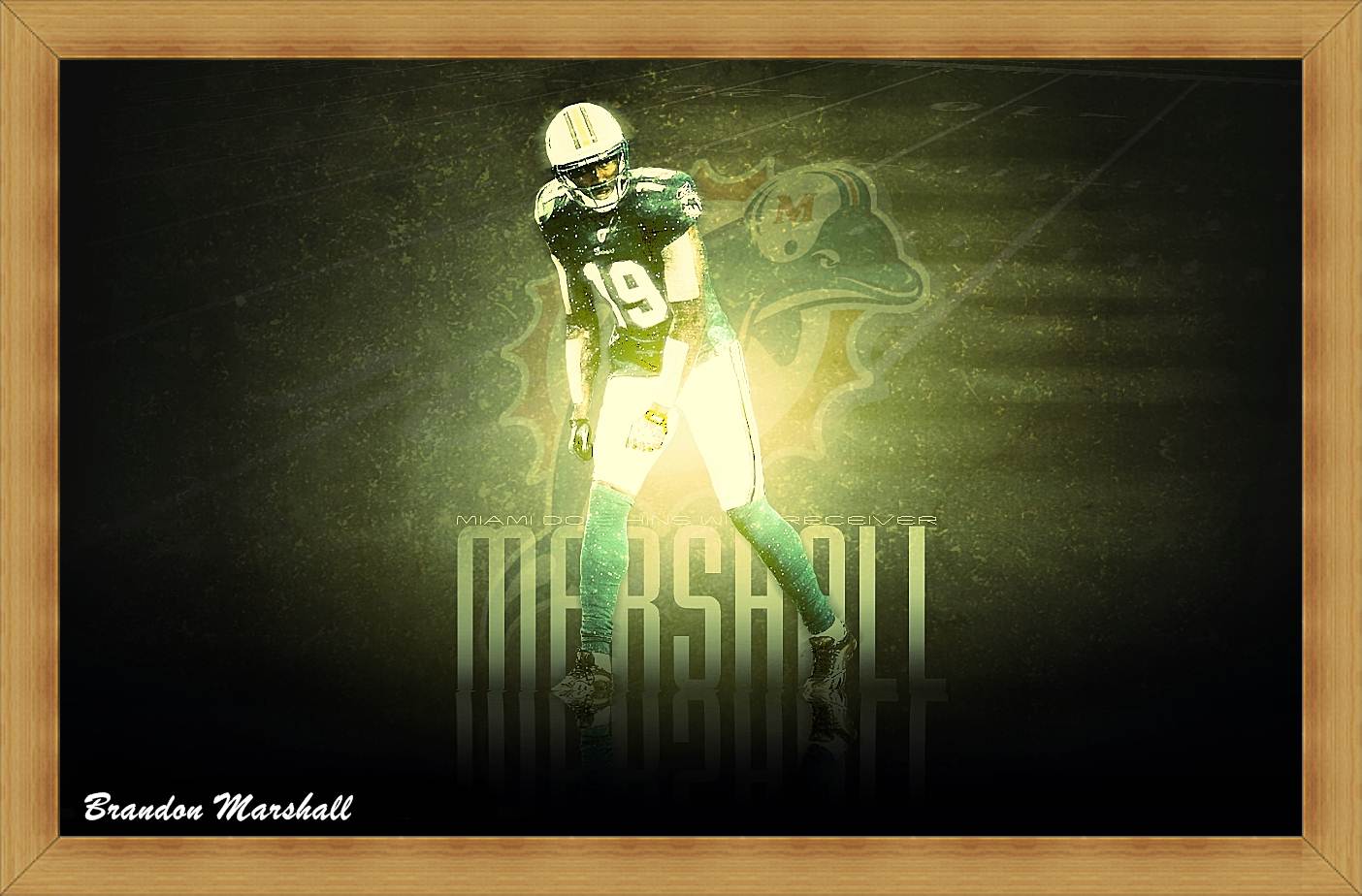 Description: A football player in a green uniform holding a ball in his hand and a gold frame around him with the words russell marshall on it.