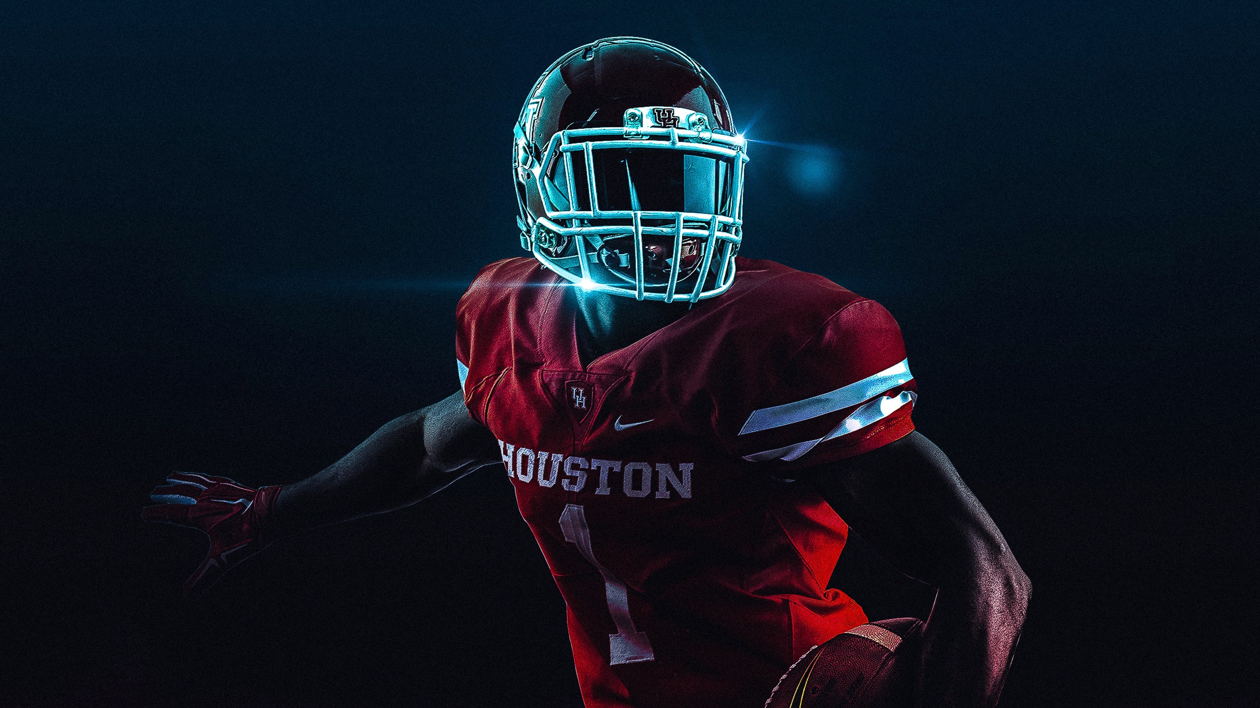 Description: A football player in a red uniform with a neon light on his face and hands out to the side.