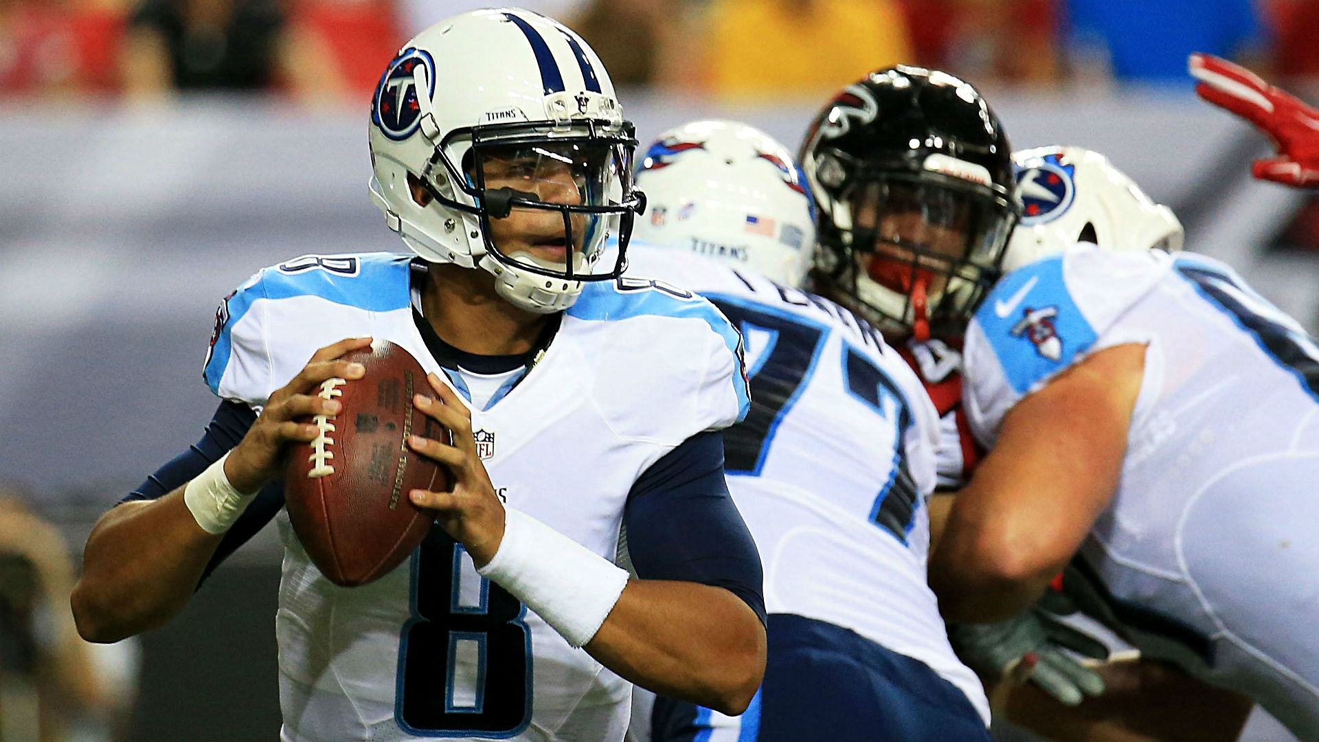 Description: A football player holding a ball in his hand and a referee behind him watching him from behind him with a red glove.