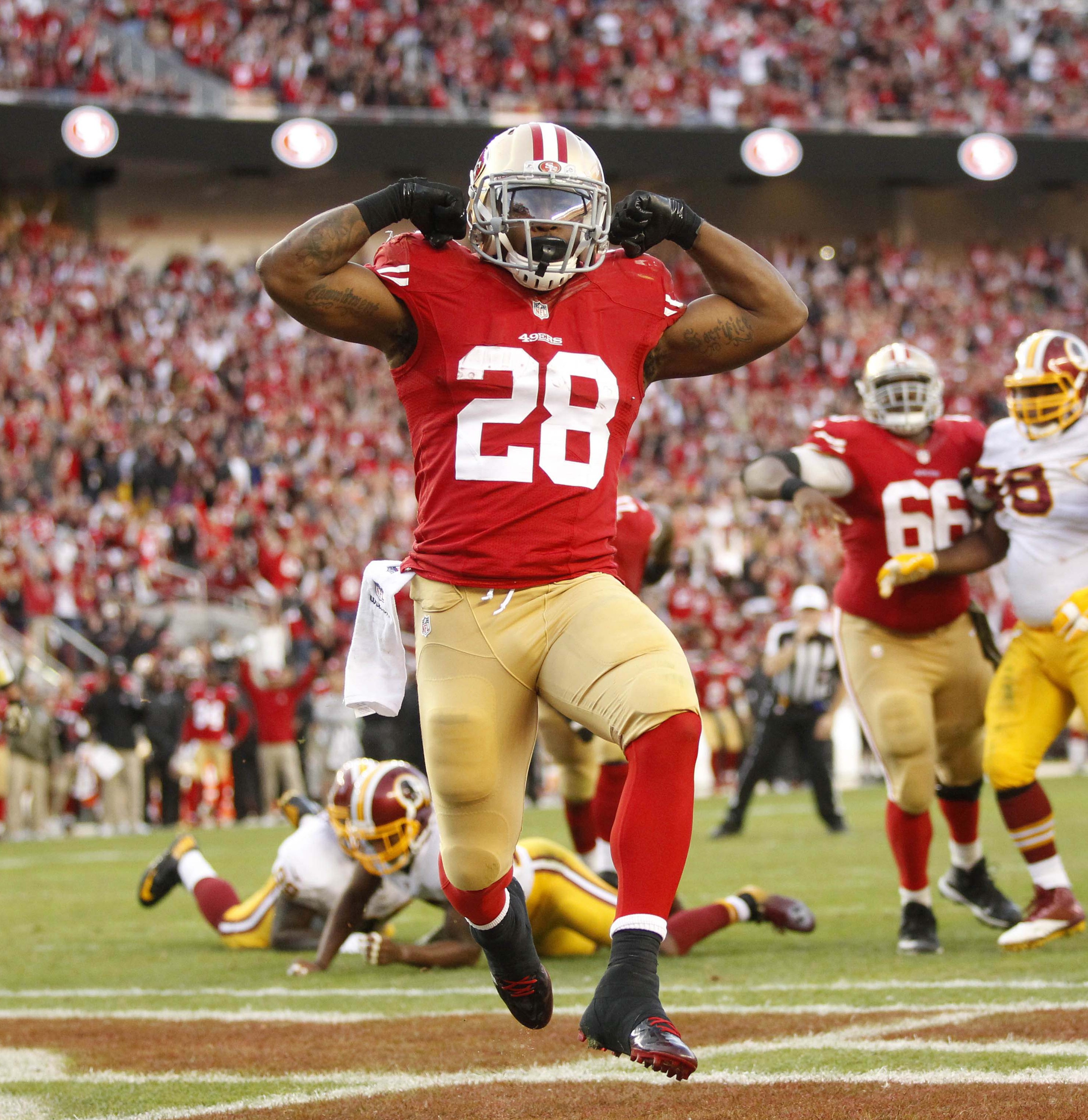 Description: A football player running on a field with a helmet on and a football in the air in front of him.