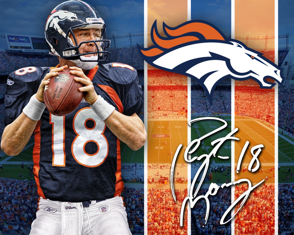 Description: A football player holding a ball in front of a stadium background with the denver cowboys logo on it and the denver bison logo on the side.