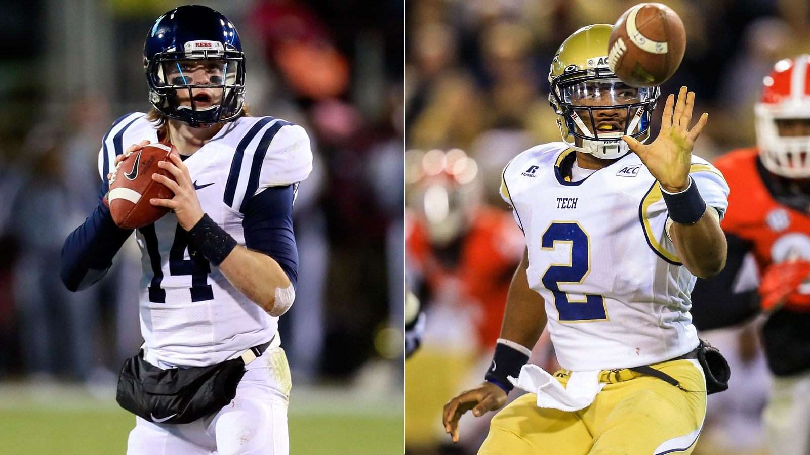 Description: Two photos of a football player throwing a ball and another man holding a football in his hand and another man holding a football.