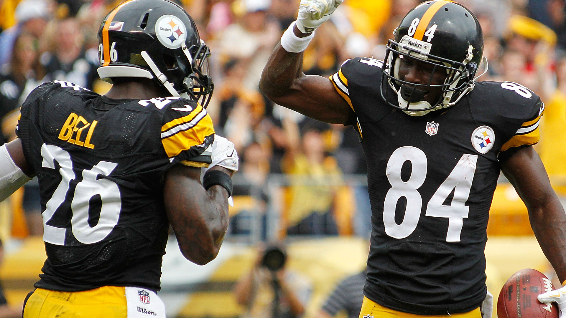 Description: Two football players are celebrating a game with a crowd in the background and a stadium full of people in the stands.