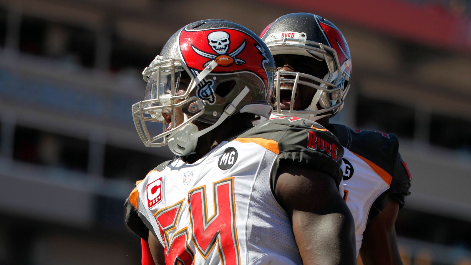 Description: Two football players wearing helmets and helmets on a field in front of a building with a clock on it.
