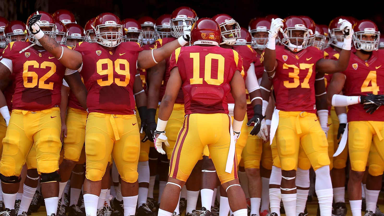 Description: A group of football players standing next to each other in uniform and numbers on their uniforms and numbers on their shirts.