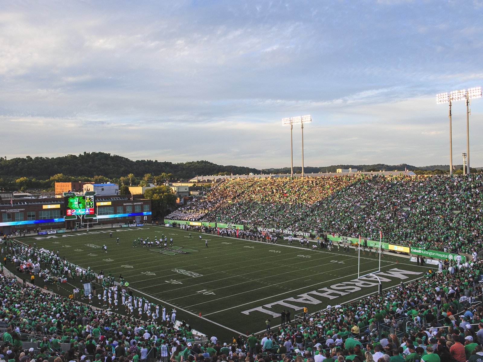 Description: A football stadium filled with people watching a game on a cloudy day with a sky background and a green field.