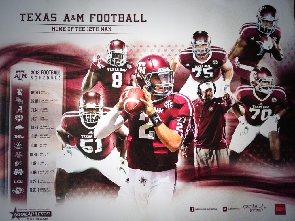 Description: A poster of a football team with a background of american flags and stars and a flag of the texas a & m football.