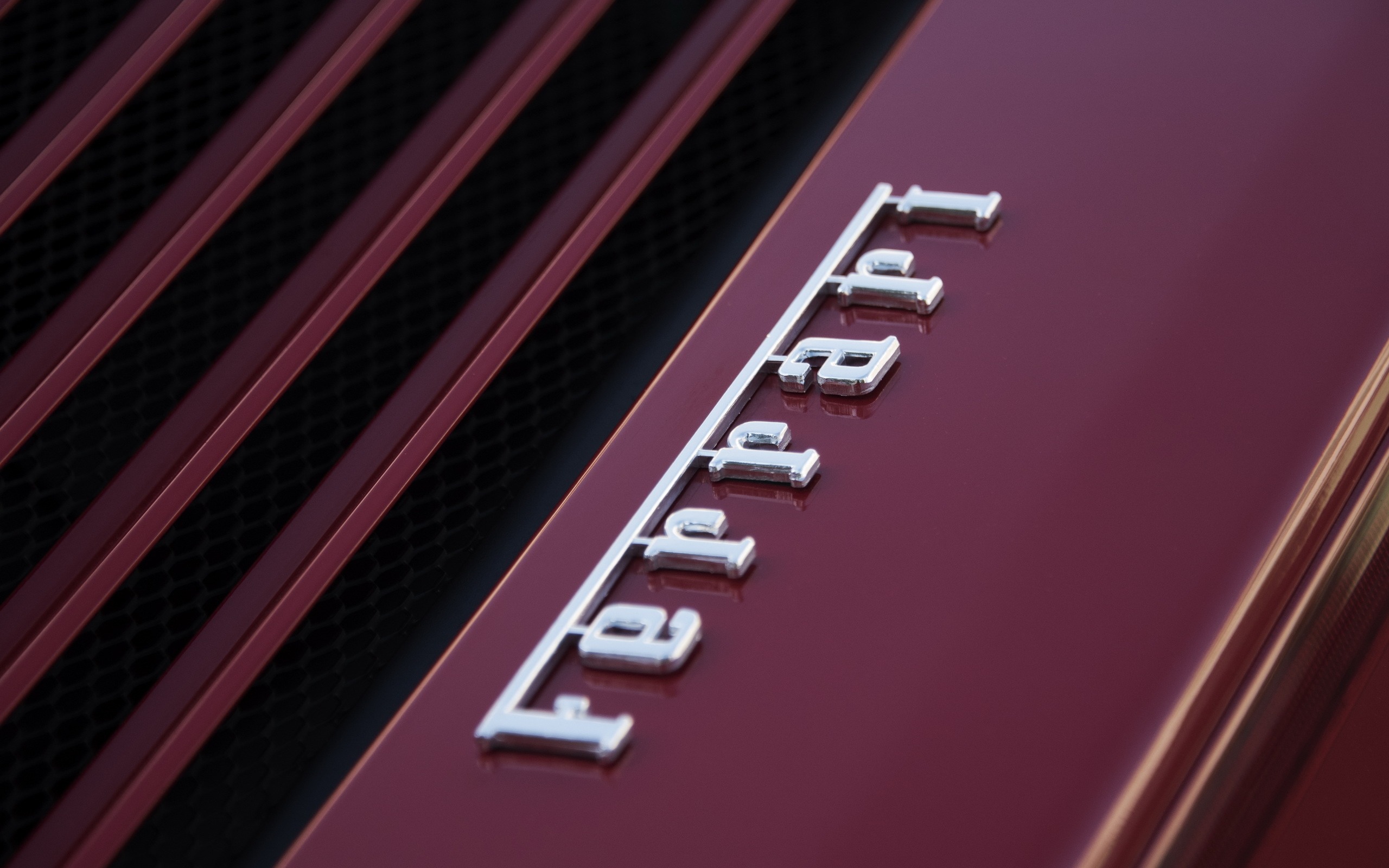 Description: A close up of the emblem on a red car's engine cover with the word ford on it.