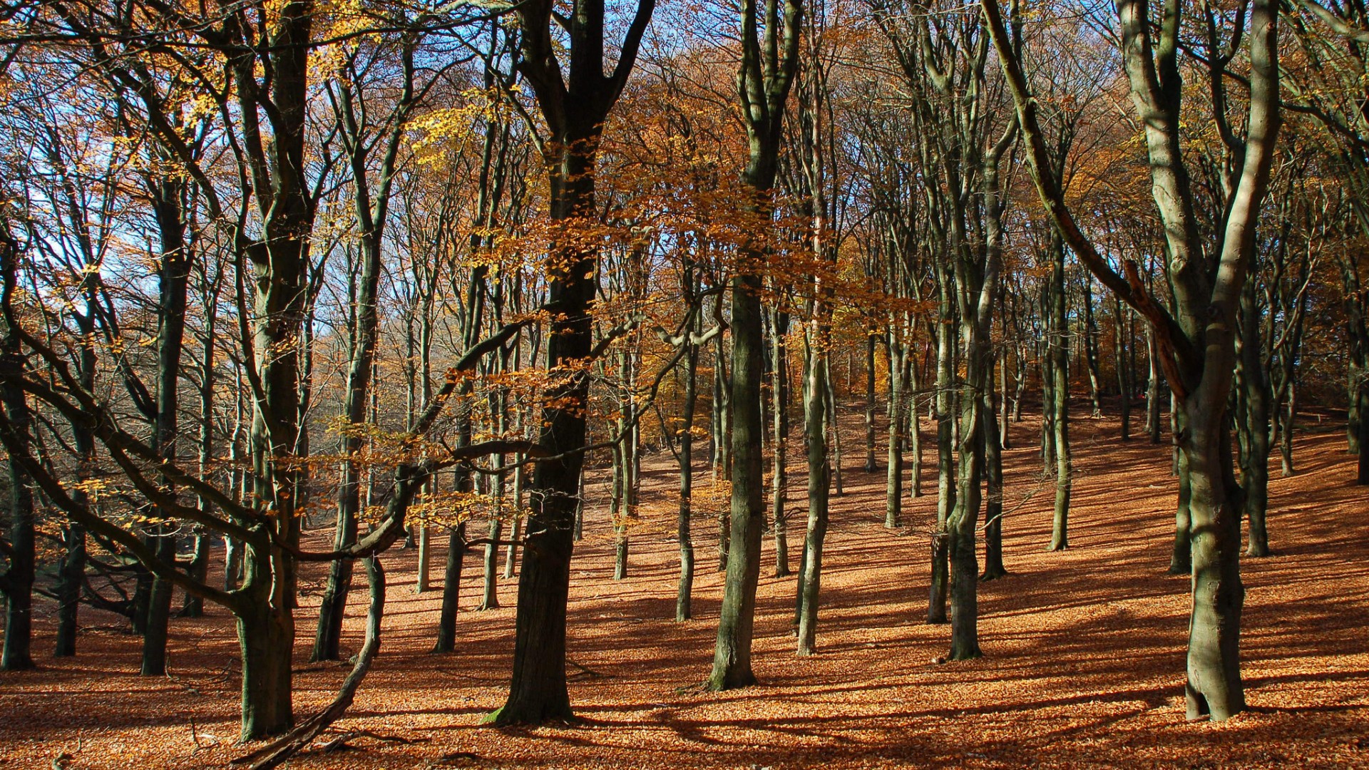 Description: A forest filled with lots of trees and leaves on the ground and a blue sky above them with a few clouds.