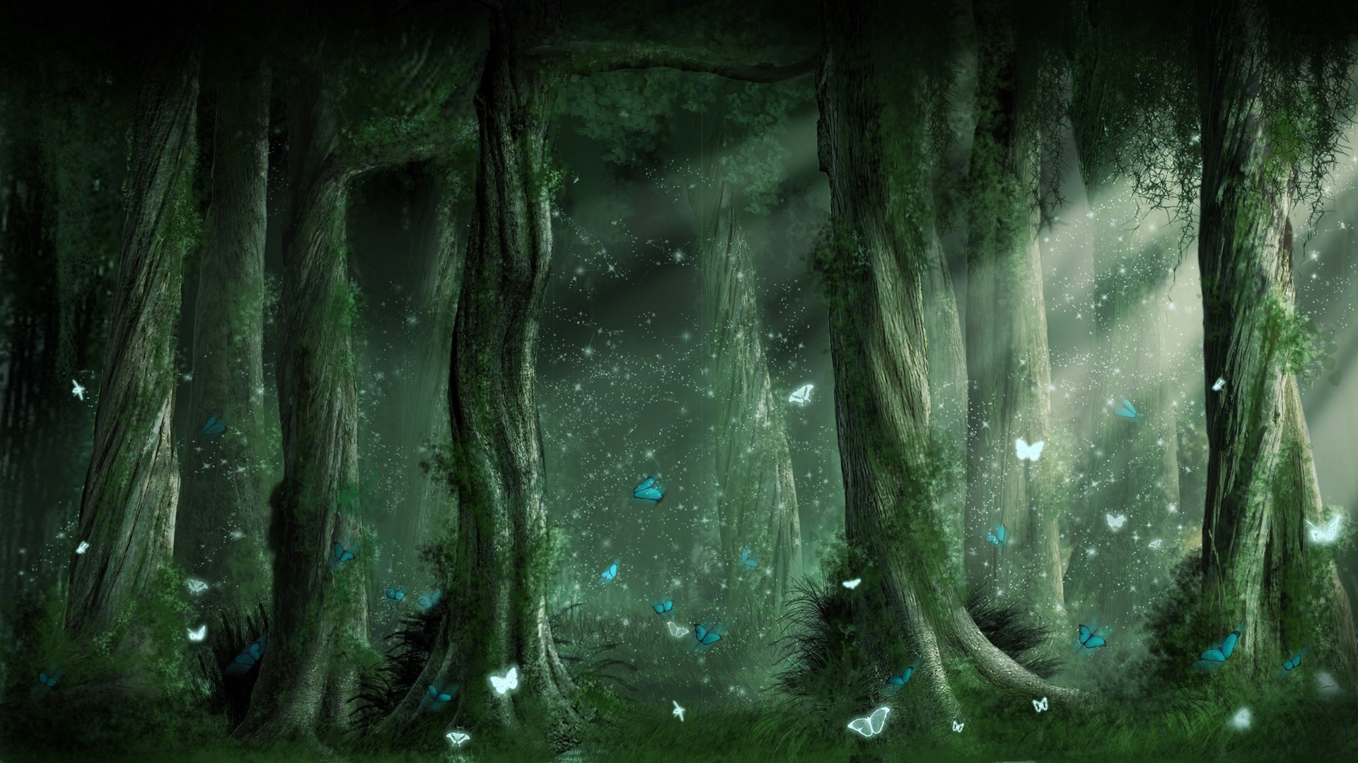 Description: A painting of a forest with butterflies flying around it and a light coming from the trees in the background.