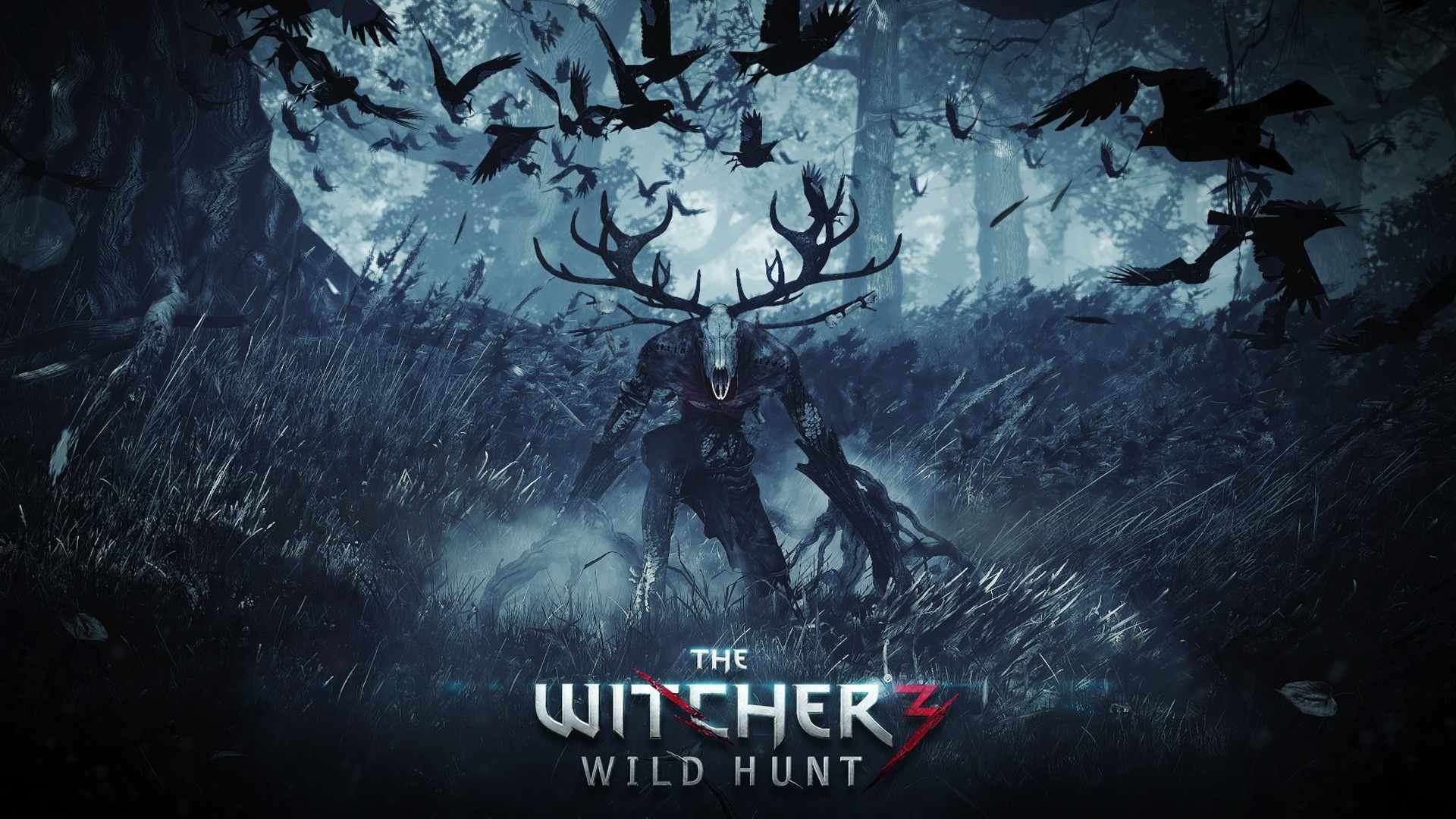 Description: A man in a forest with a deer head and antlers on his head.