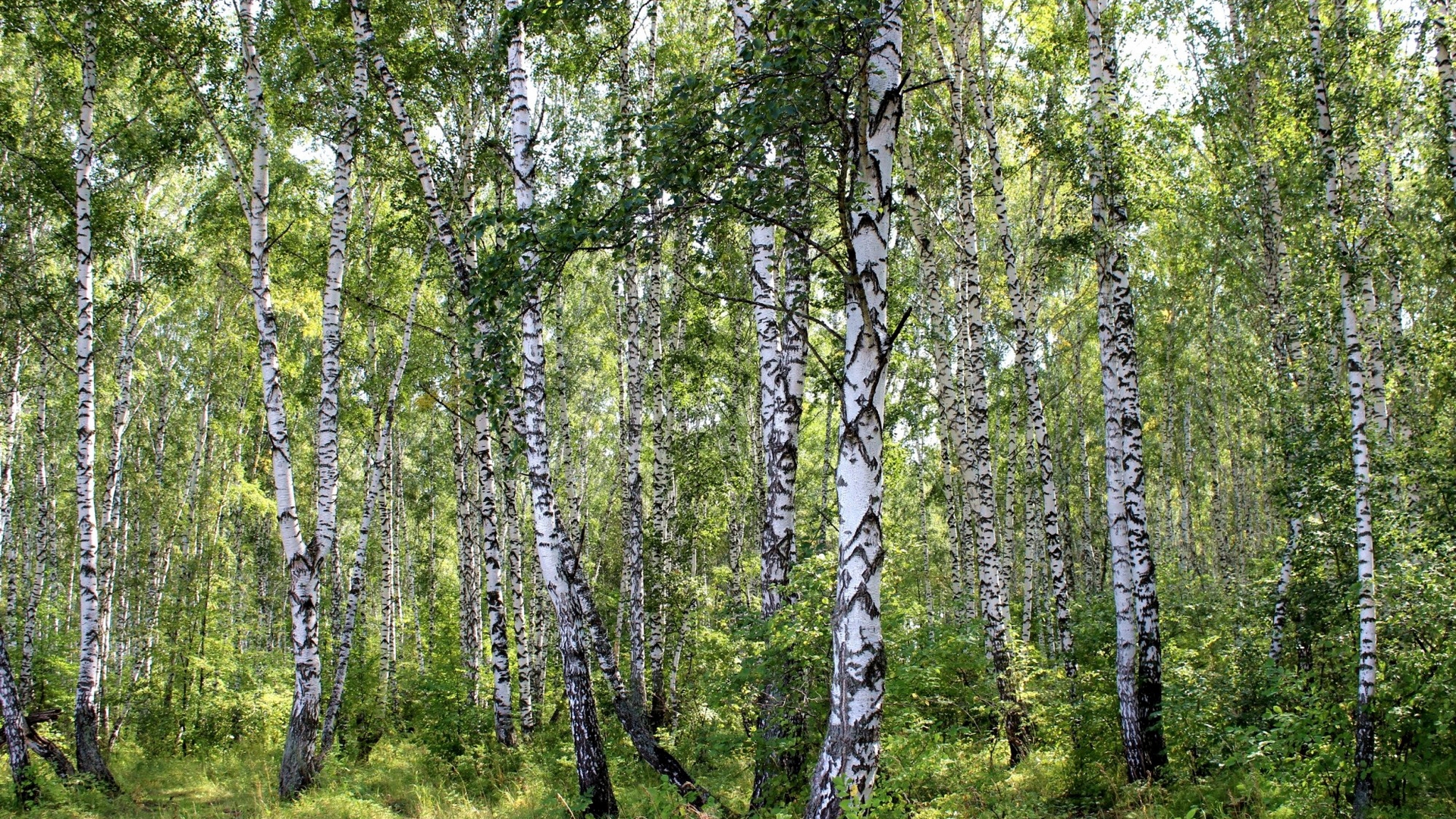 Description: A forest filled with lots of tall trees next to a forest filled with green grass and trees with white trunks.