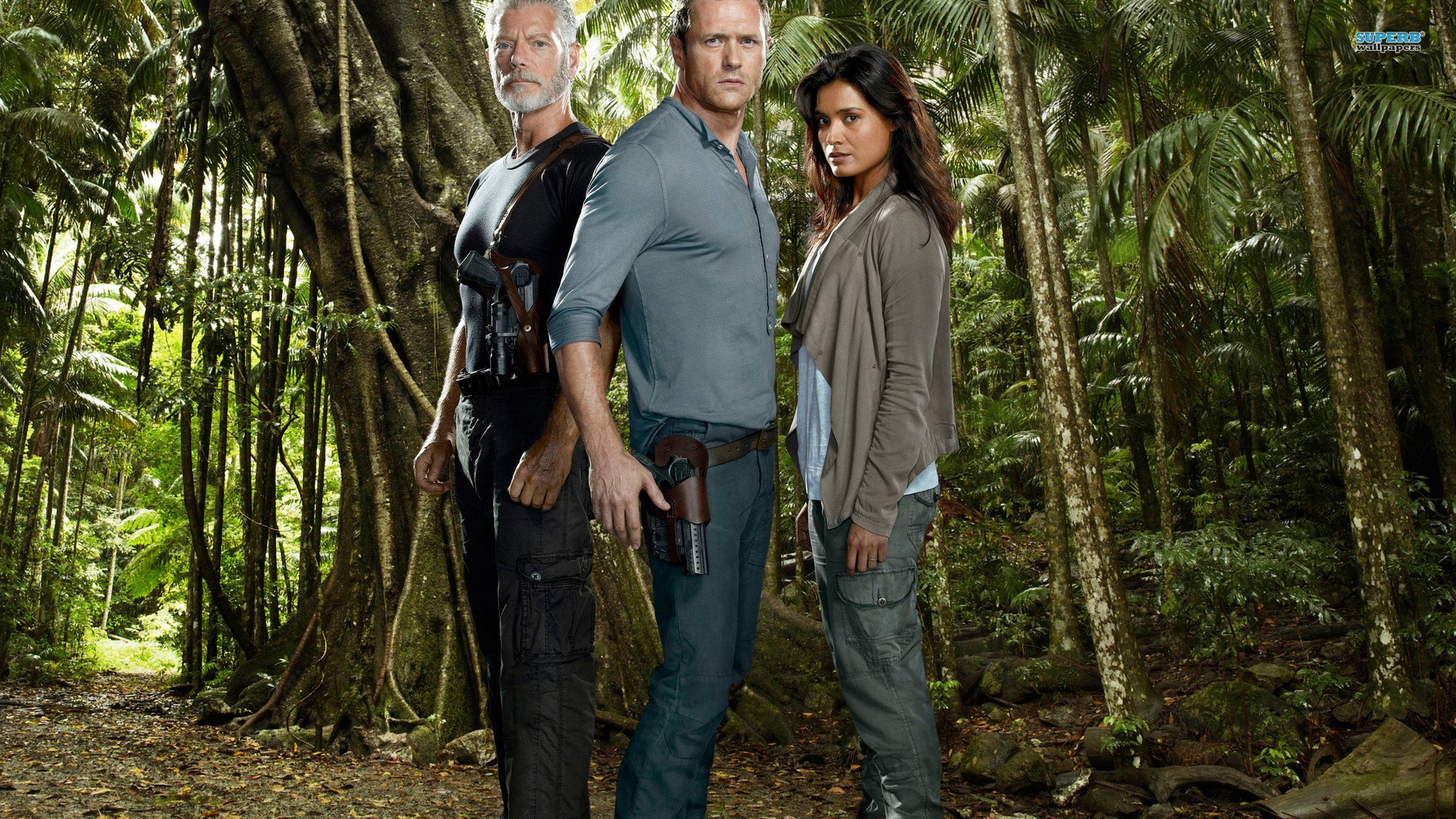 Description: A group of people standing in a forest with trees in the background and a man in a blue shirt.