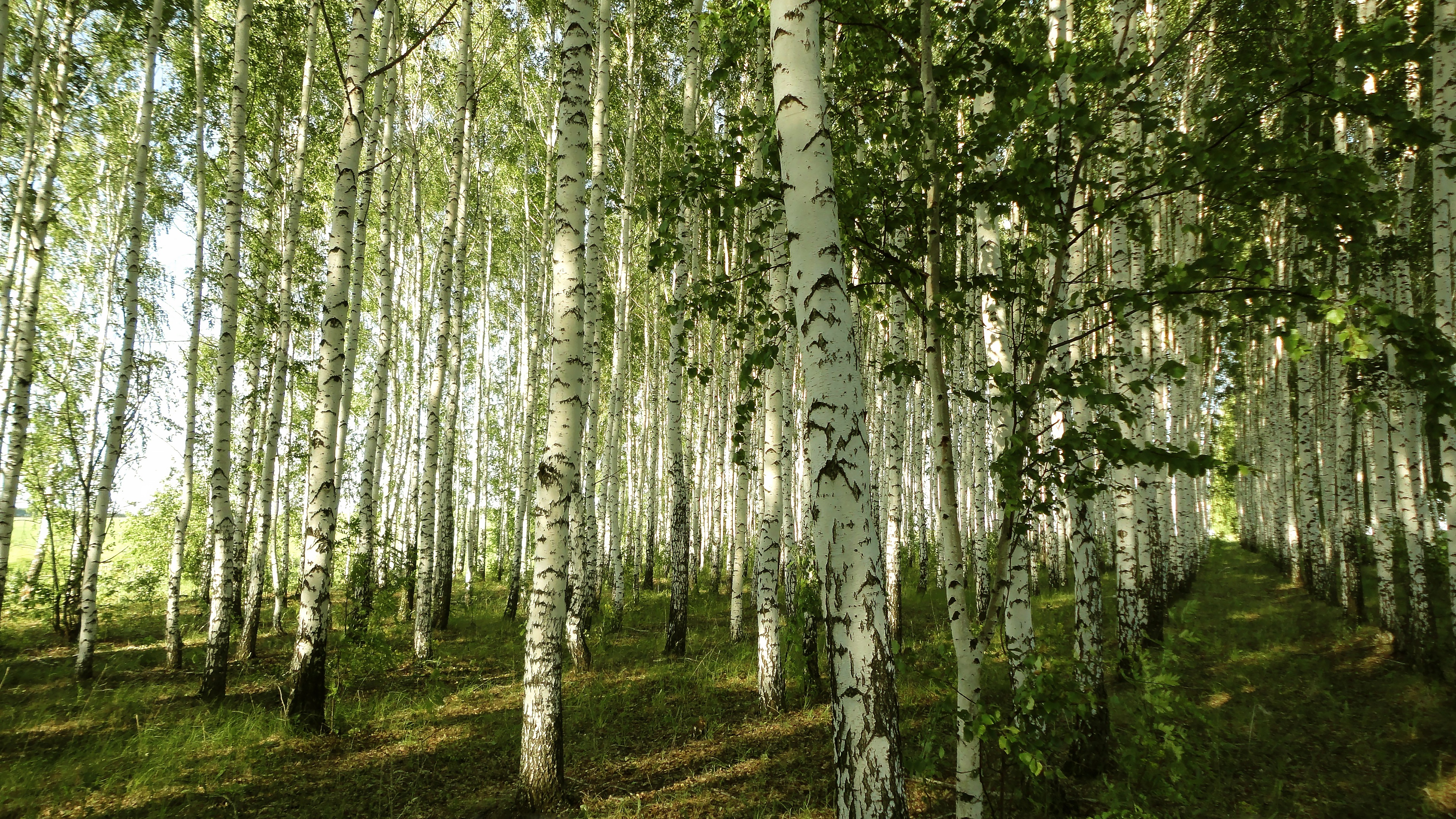 Description: A grove of trees in a forest with green leaves on them and a blue sky in the background with a few clouds.