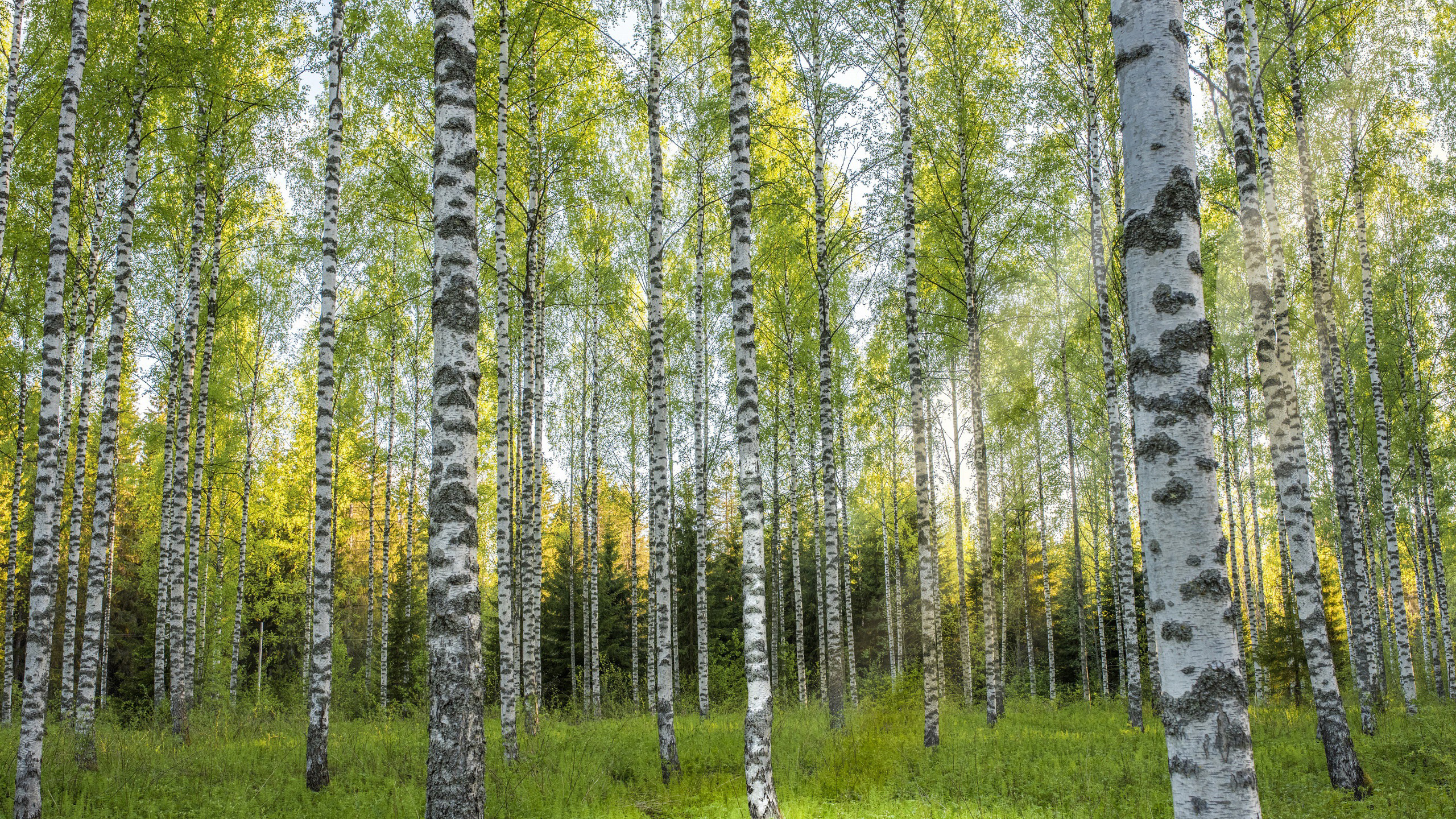 Description: A grove of trees in a forest with green grass and tall trunks of trees in the background.