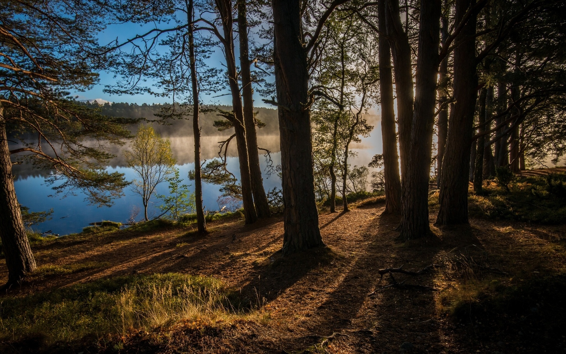 Description: A forest with a lake in the background and fog in the air on the ground and trees on the ground.
