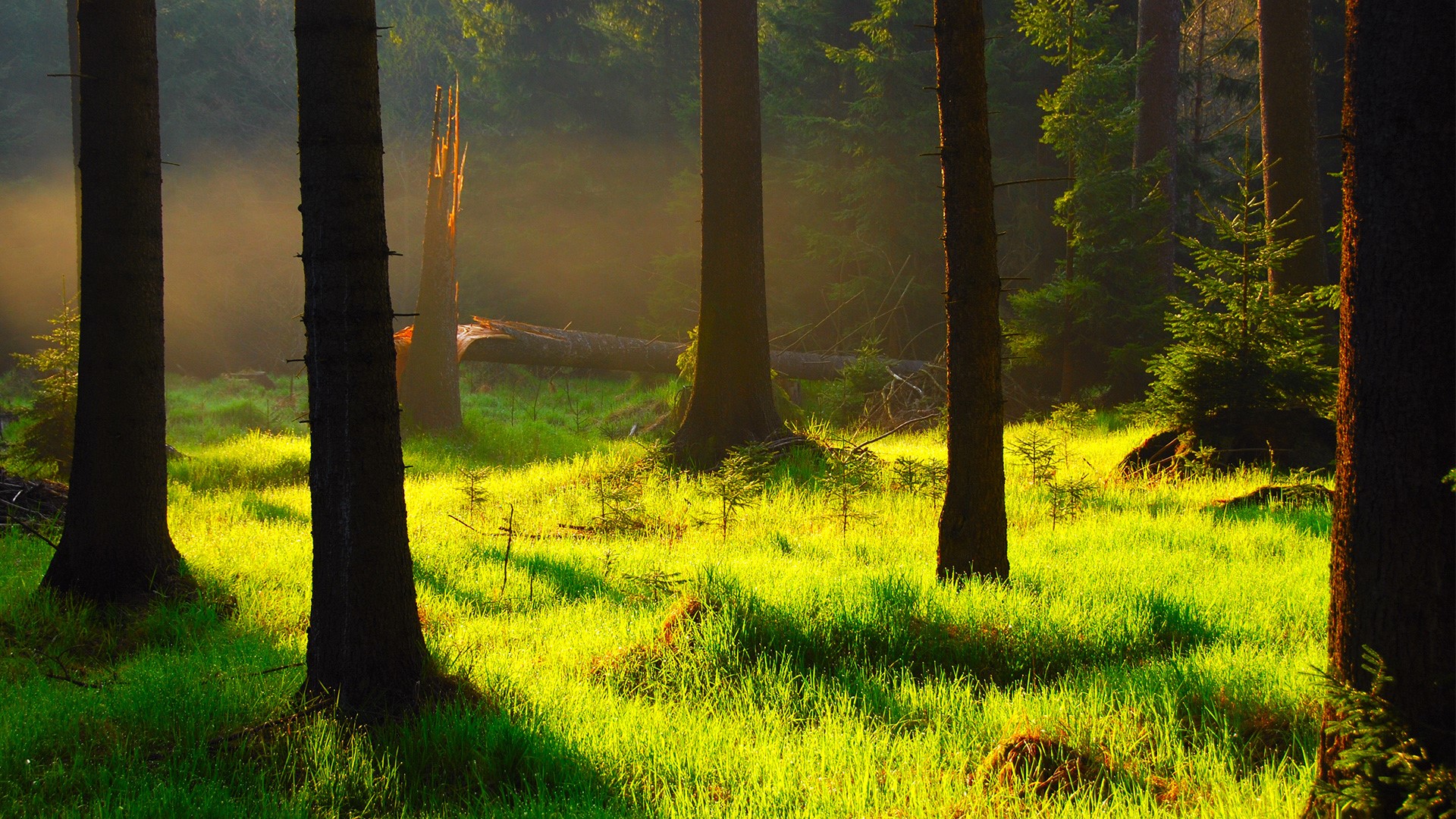 Description: A forest with a lot of trees and grass in the foreground and a light coming through the trees.