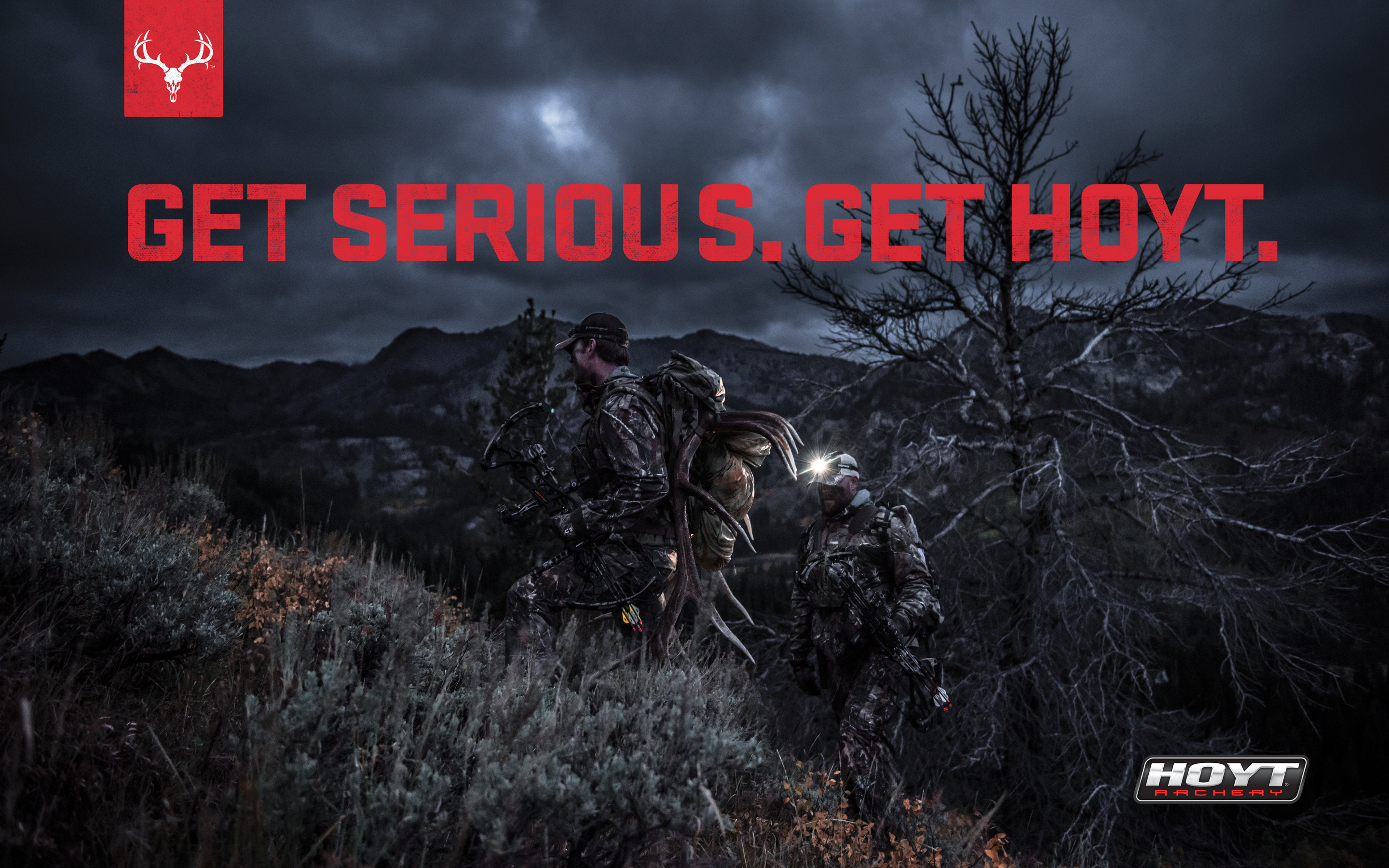 Description: A group of men walking through a forest under a cloudy sky with the words get serious get hoy.