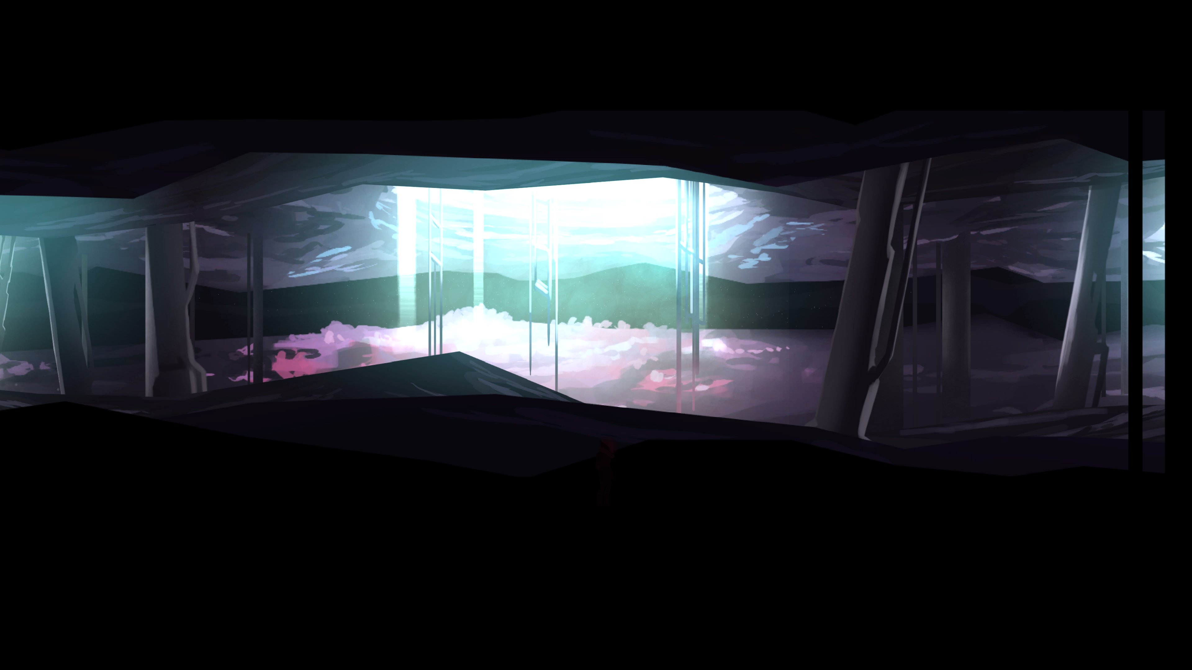 Description: A scene of a forest with a mountain in the background and a person walking in the distance in the foreground.