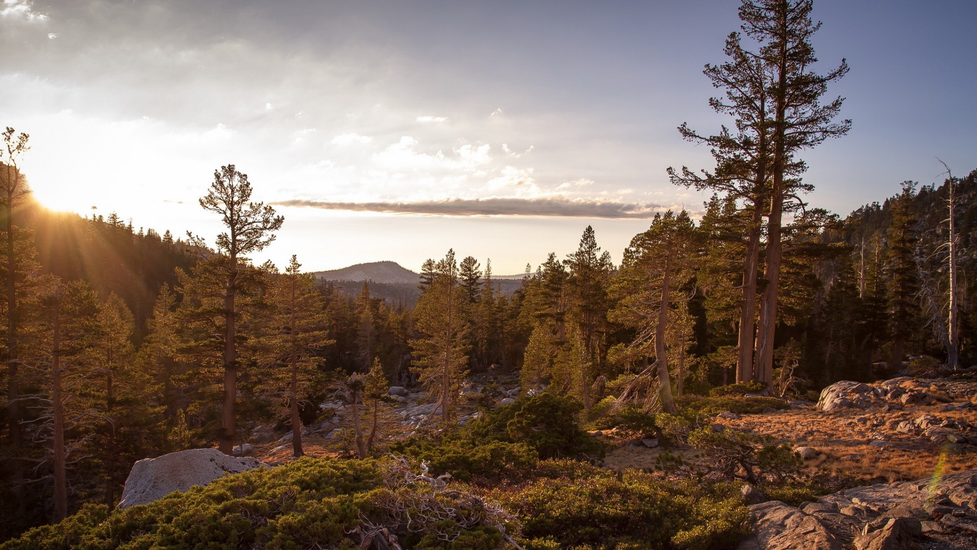 Description: A forest with a mountain in the background and a sun setting in the distance with clouds in the sky.