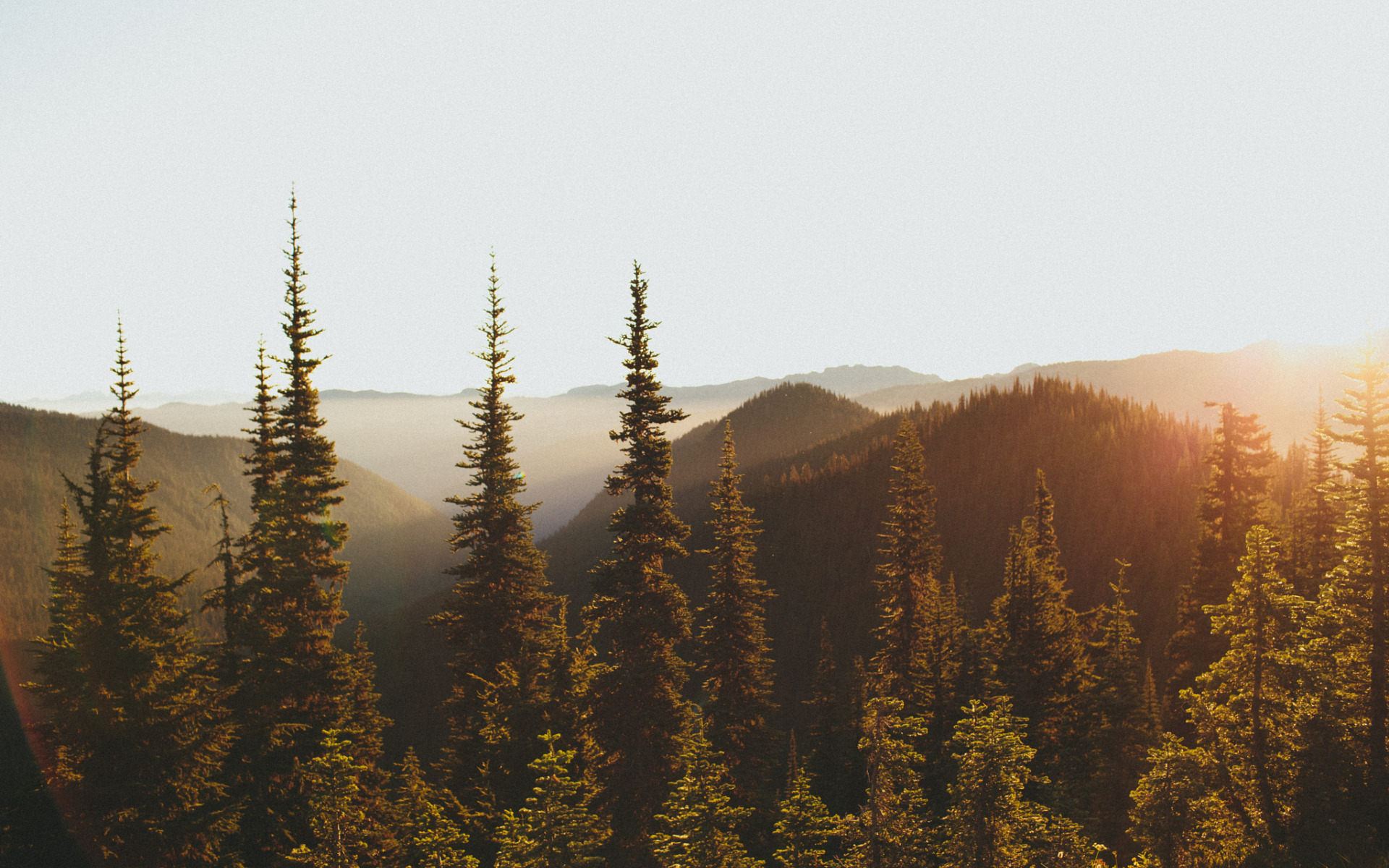 Description: A view of a forest with mountains in the background and a sunbeam in the foreground with a few trees in the foreground.