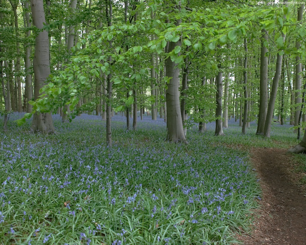 Description: A path through a forest with bluebells and trees in the background.