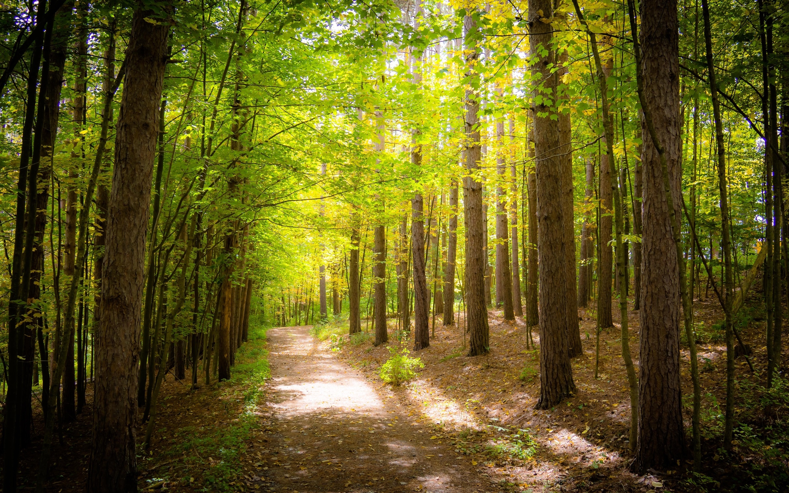 Description: A path in the woods with lots of trees on both sides of it and a lot of leaves on the ground.