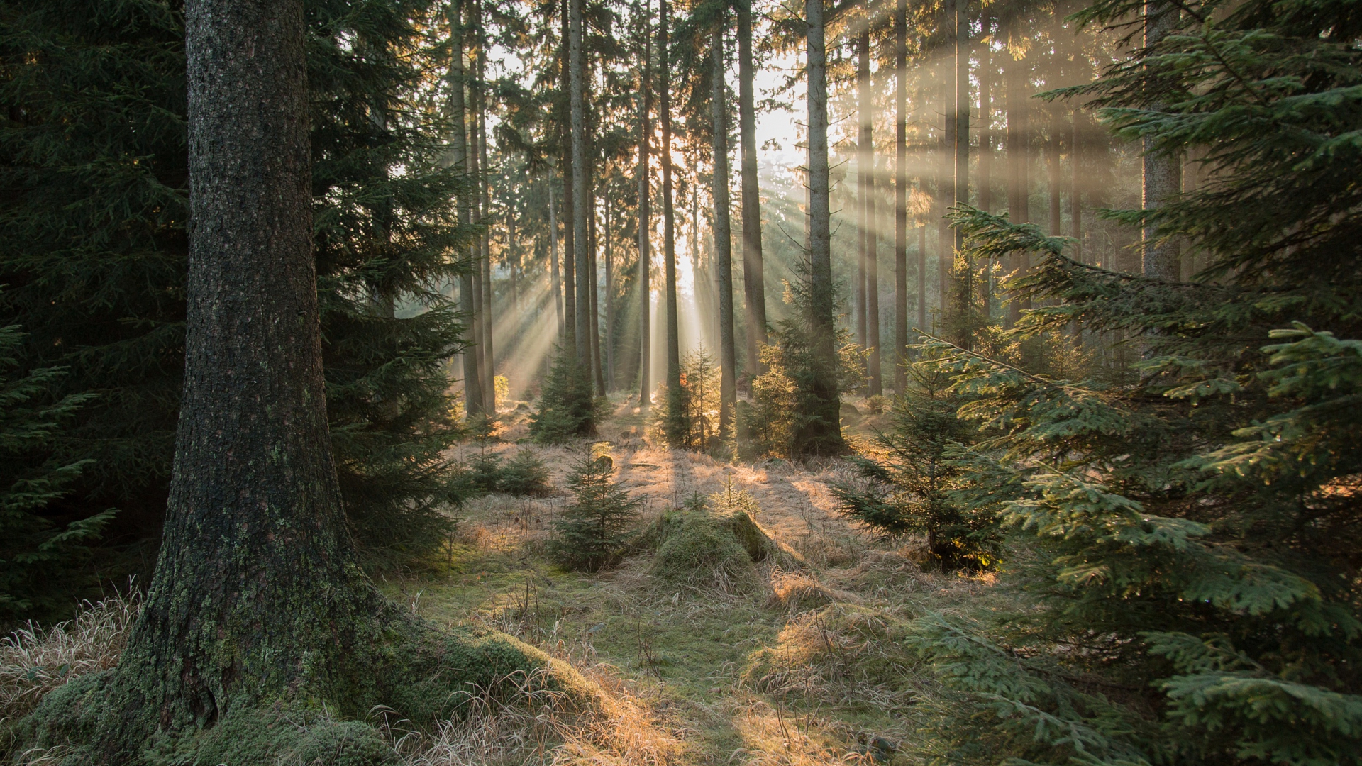 Description: A path through a forest with sunbeams shining through the trees and grass on the ground and in the foreground.